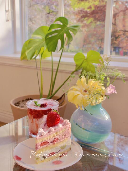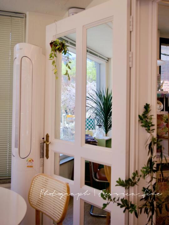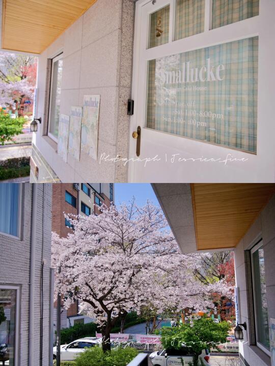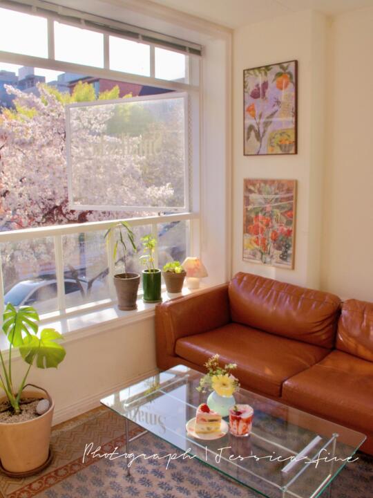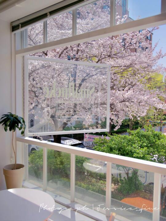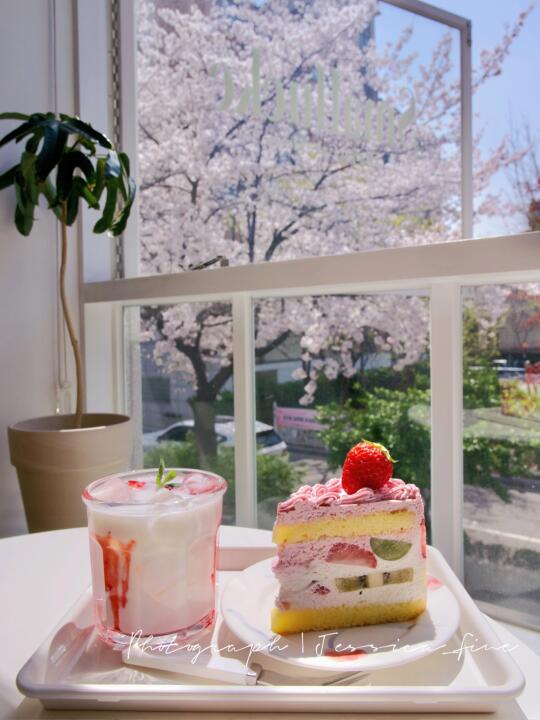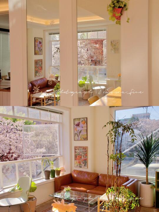 每天开门之前门口就排满了人,可能因为门口有两颗樱花树吧,今年延南洞看樱花的人好多,这家店一年四季的窗景都很好看,再加上蛋糕颜值高,这段时间在现代百货开了快闪,快闪会卖各种形状的这个蛋糕,但是总店只有这种三角形切块的,店里的海报配色审美都超好[亲一个R] 我是第一个到的,来的第二队韩国人一直在往前挤想插队[生气R]店员都说了按照排队顺序找座位,结果进去之后都在抢完全不听的,不过他们选的那个沙发位置今年樱花开的不太好看,还有一棵树亖掉了,我是去年坐的那个位置哈哈,沙发的照片都是去年的[吃瓜R]