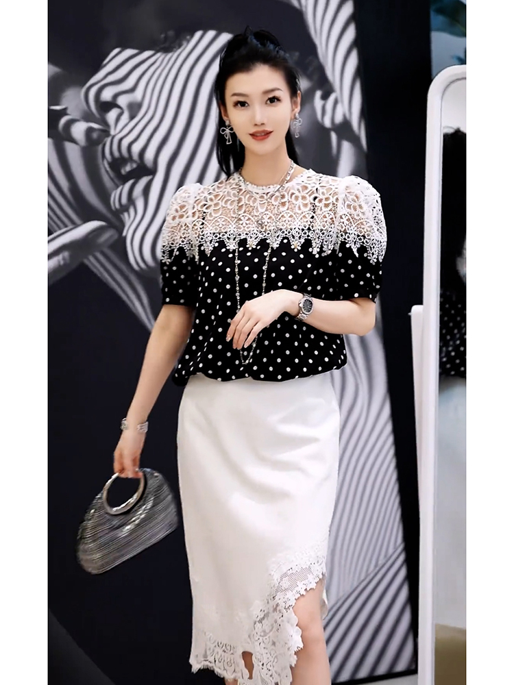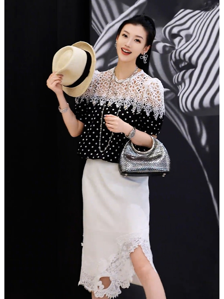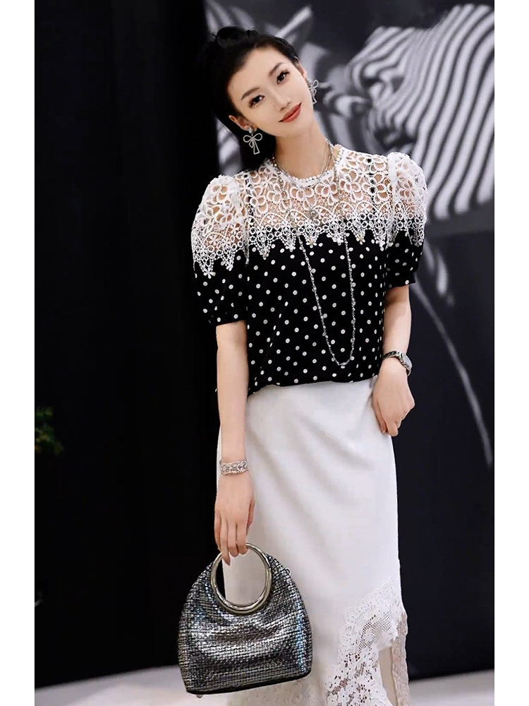 宽松慵懒黑色波点蕾丝拼接T恤女