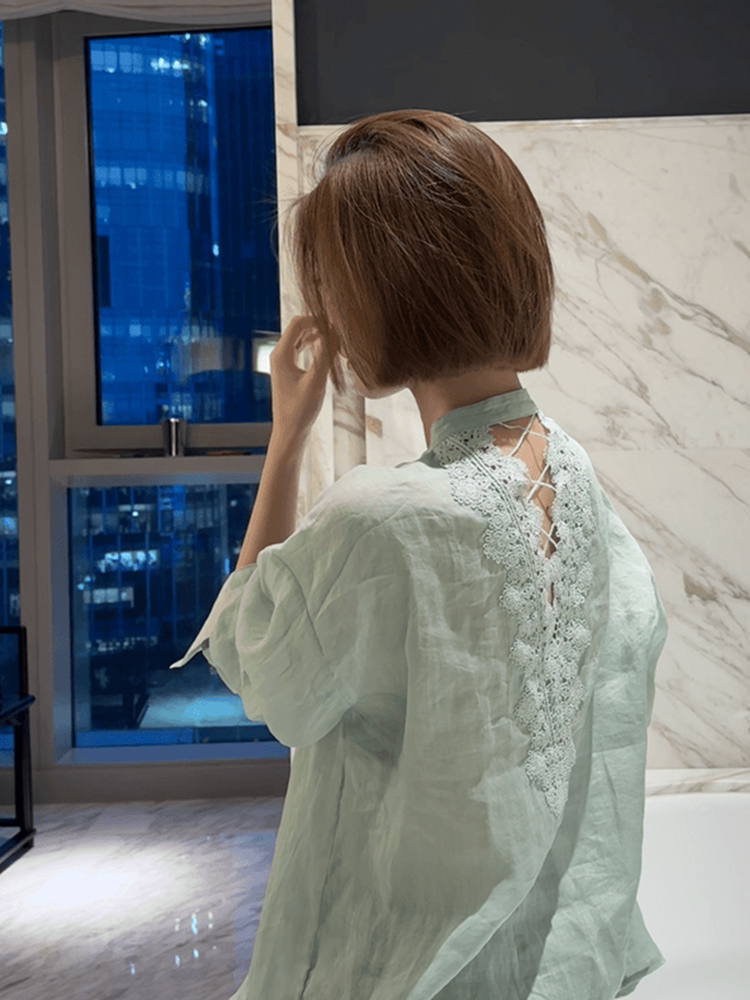 轻奢高级感多巴胺绿色蕾丝刺绣亚麻衬衫女
