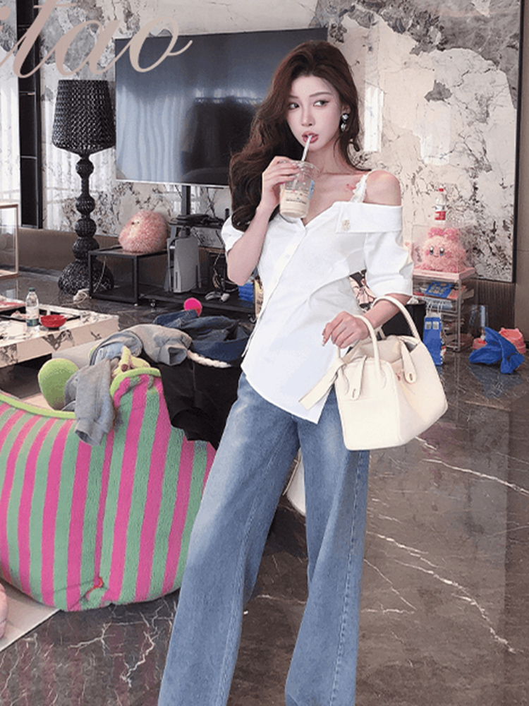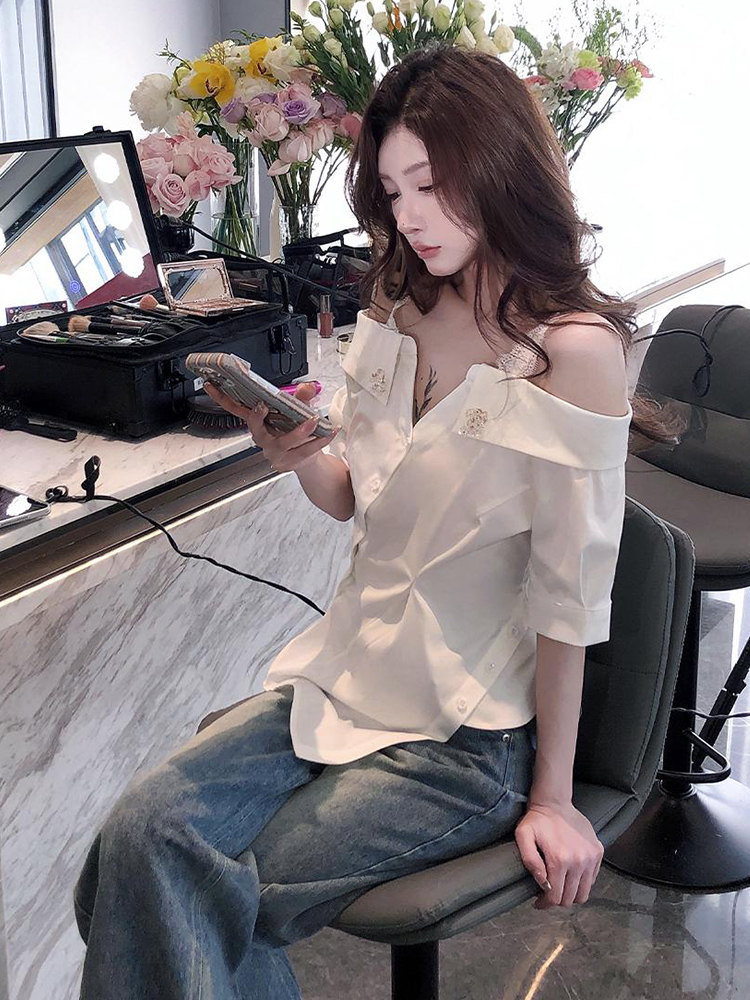 独特别致漂亮白色一字肩长袖衬衫