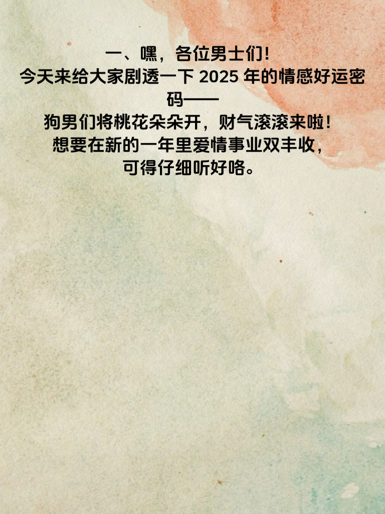 一、嘿,各位男士们!今天来给大家剧透一下 2025 年的情感好运密码——狗男们将桃花朵朵开,财气滚滚来啦!想要在新的一年里爱情事业双丰收,可得仔细听好咯。 二、先说桃花朵朵开。首先,要学会提升自己。保持良好的形象,注重仪表整洁,让自己看起来精神焕发。同时,不断丰富内在,培养有趣的灵魂,这样才能吸引到更优质的女生。在与人相处中,真诚是必杀技,真心对待每一个遇到的人,尤其是心仪的她。多参加社交活动,扩大自己的社交圈,增加遇见缘分的机会。 三、再说财气滚滚来。这可不只是指物质财富哦,在感情中,懂得付出也是一种财富。用心为她准备小惊喜,在她需要时及时出现并给予支持。当你在感情中投入足够多的爱与关怀,收获的也会是满满的幸福。而且,积极向上的心态会吸引来更多美好的事物,包括爱情和财富。相信自己,在 2025 年,只要你努力,爱情和好运都会围绕着你,让你的生活如繁花盛开,财富也会随之而来!