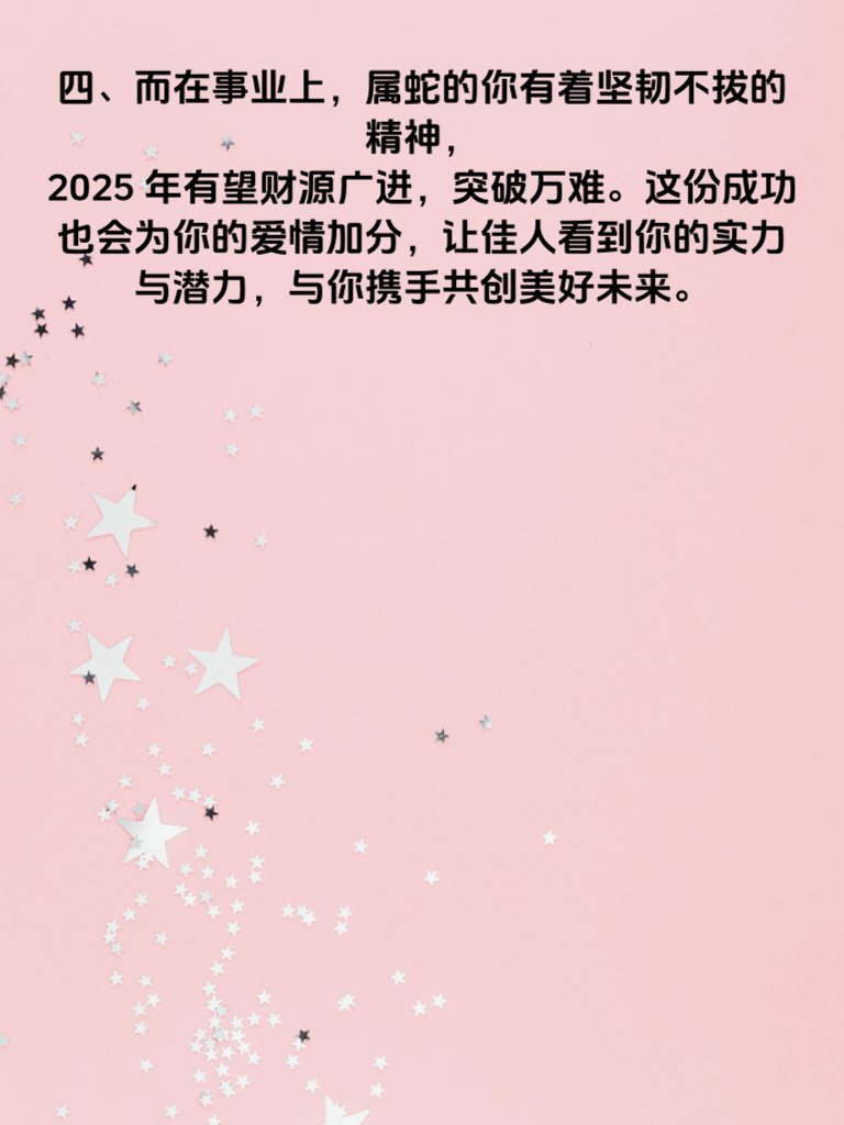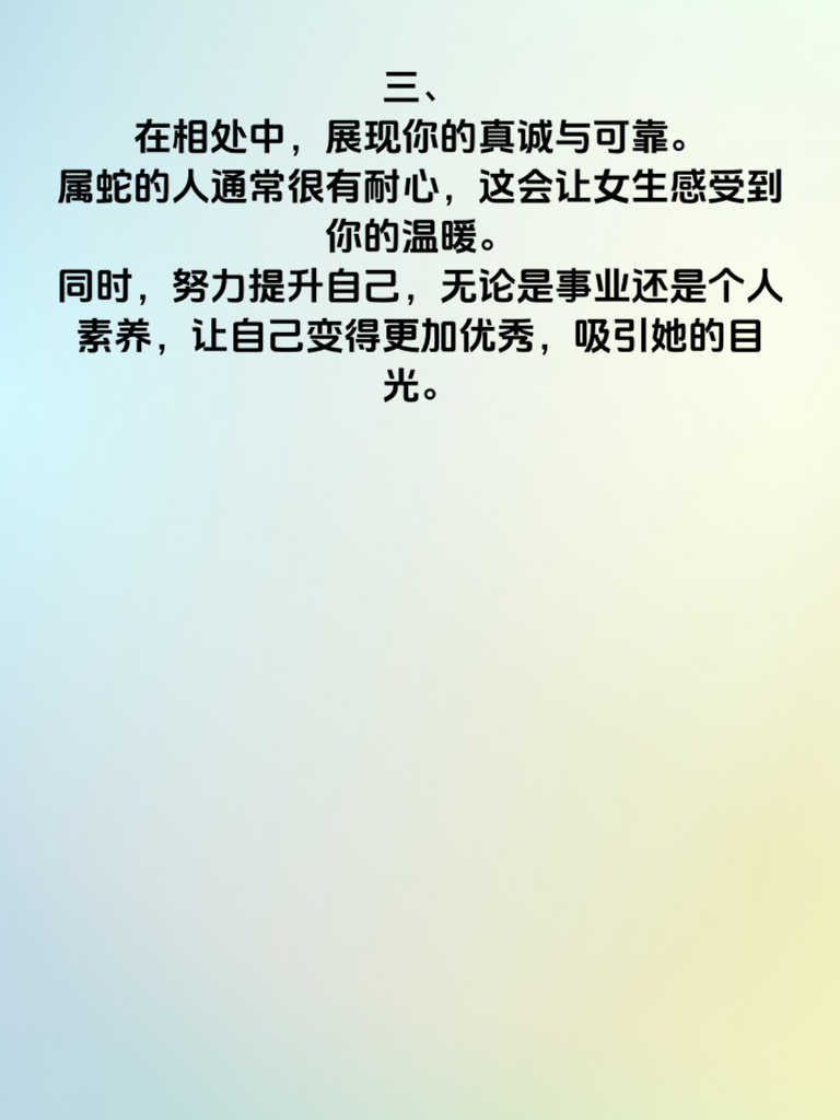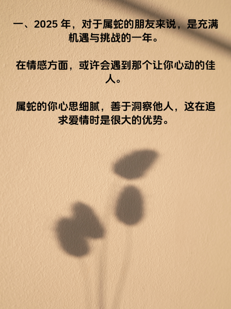 一、2025 年,对于属蛇的朋友来说,是充满机遇与挑战的一年。在情感方面,或许会遇到那个让你心动的佳人。属蛇的你心思细腻,善于洞察他人,这在追求爱情时是很大的优势。 二、当遇到心仪的女生,不要急于表白。先从朋友做起,慢慢了解她的喜好、兴趣。比如,知道她喜欢看某部电影,你可以在适当的时候和她聊聊电影情节,拉近彼此距离。 三、在相处中,展现你的真诚与可靠。属蛇的人通常很有耐心,这会让女生感受到你的温暖。同时,努力提升自己,无论是事业还是个人素养,让自己变得更加优秀,吸引她的目光。 四、而在事业上,属蛇的你有着坚韧不拔的精神,2025 年有望财源广进,突破万难。这份成功也会为你的爱情加分,让佳人看到你的实力与潜力,与你携手共创美好未来。