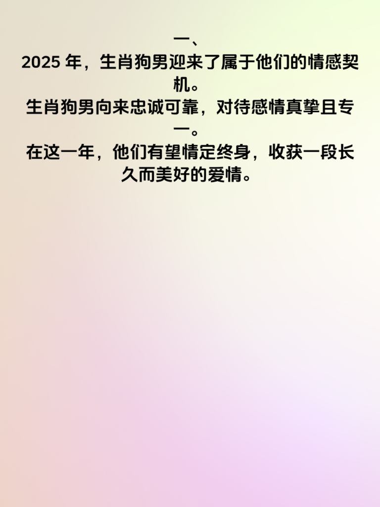 一、2025 年,生肖狗男迎来了属于他们的情感契机。生肖狗男向来忠诚可靠,对待感情真挚且专一。在这一年,他们有望情定终身,收获一段长久而美好的爱情。 二、对于追求女生,生肖狗男有着独特的魅力。他们踏实稳重,能给女生足够的安全感。在与心仪女生相处时,真诚地倾听她的想法,用心去关心她的生活点滴,会让女生感受到深深的温暖。 三、在事业方面,2025 年生肖狗男财星耀四方。这也为他们的爱情增添了助力。他们可以凭借自身的努力和财运,为未来的家庭创造更好的物质条件。 四、当追求女生时,不妨在适当的时候展示自己的经济实力和上进心。比如一起规划未来时,自信地说出对生活的憧憬,让女生看到你们美好的未来蓝图。生肖狗男在 2025 年,只要把握好机会,定能在爱情和事业上双丰收,收获属于自己的幸福人生。