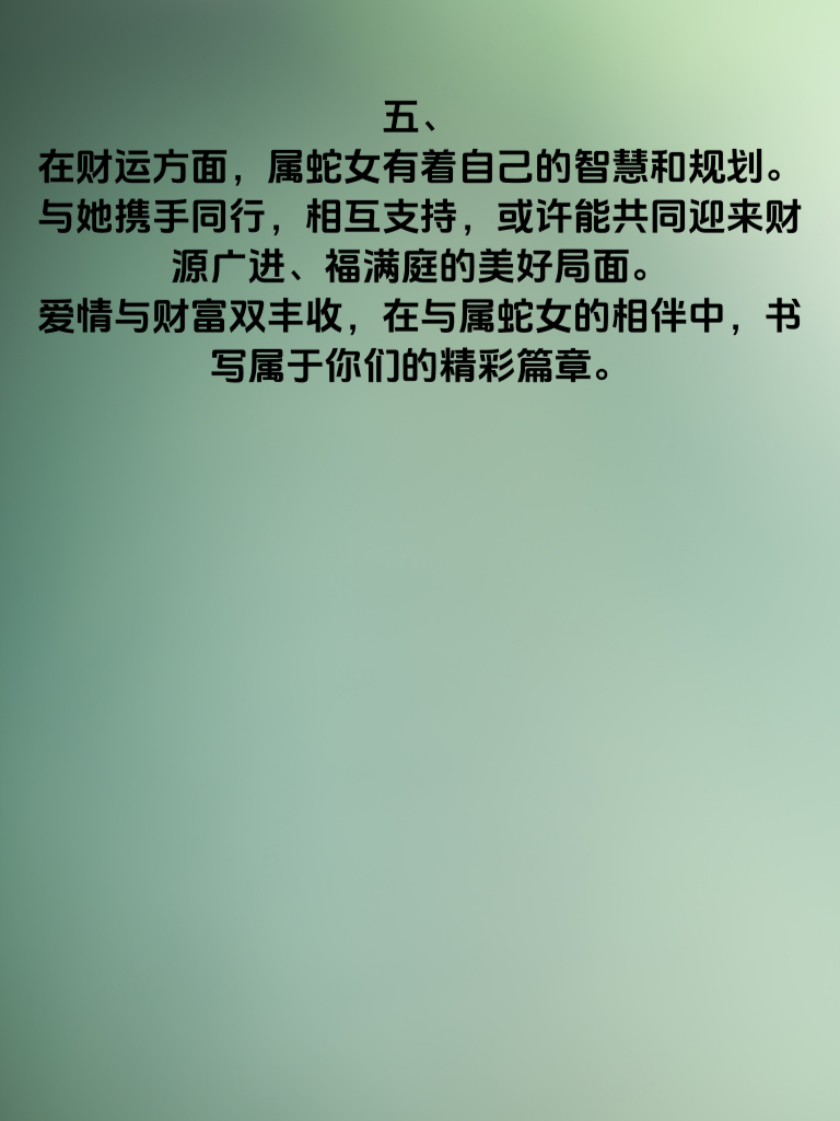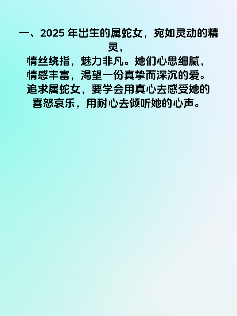 一、2025 年出生的属蛇女,宛如灵动的精灵,情丝绕指,魅力非凡。她们心思细腻,情感丰富,渴望一份真挚而深沉的爱。追求属蛇女,要学会用真心去感受她的喜怒哀乐,用耐心去倾听她的心声。 二、与属蛇女相处,真诚是打开她心扉的钥匙。在她面前,无需伪装,展现最真实的自己。她们欣赏有担当、有责任感的男生,能在生活中给予她依靠和安全感。 三、属蛇女有着独特的审美和生活品味。不妨在约会时,精心安排一些富有情趣的活动,如去艺术展览、品尝精致美食等,与她一同探索生活中的美好,增进彼此的了解和感情。 四、同时,属蛇女在事业上也有着自己的追求。支持她的梦想和事业发展,与她共同进步,会让她对你另眼相看。当她在工作中遇到困难时,给予鼓励和帮助,成为她坚强的后盾。 五、在财运方面,属蛇女有着自己的智慧和规划。与她携手同行,相互支持,或许能共同迎来财源广进福满庭的美好局面。爱情与财富双丰收,在与属蛇女的相伴中,书写属于你们的精彩篇章。
