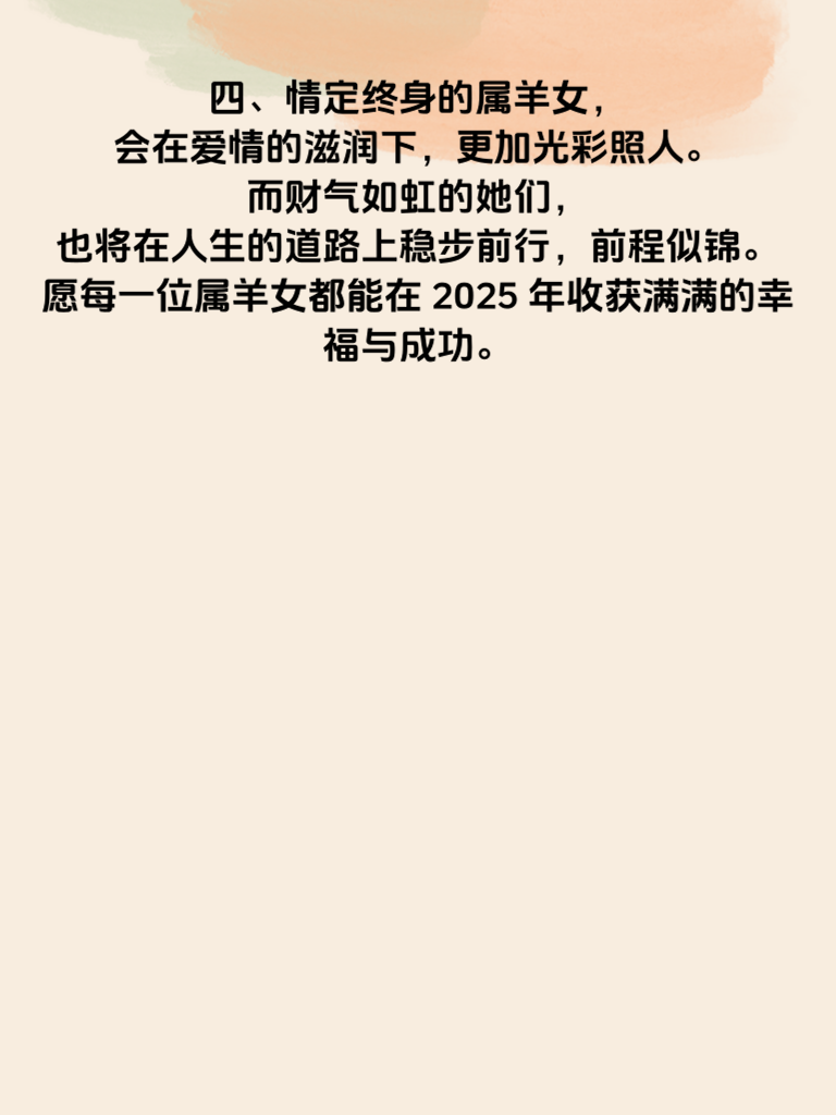 一、2025 年,对于属羊的女生来说,注定是不平凡的一年。在这一年里,她们将情定终身,收获属于自己的甜蜜爱情。属羊女温柔善良,对待感情真挚且细腻,她们的真心总会吸引到那个对的人。 二、在追求爱情的道路上,属羊女要保持自信。不要因为自己的温柔而过度迎合,要勇敢地表达自己的想法和感受。她们独特的气质会在相处中逐渐散发魅力,让心仪之人深深着迷。 三、同时,这一年属羊女的财气也如虹般闪耀。她们凭借自身的努力和智慧,在职场或生活中会有不错的收获。有了经济基础的支撑,她们能更好地享受爱情,也能为未来的生活打下坚实基础。 四、情定终身的属羊女,会在爱情的滋润下,更加光彩照人。而财气如虹的她们,也将在人生的道路上稳步前行,前程似锦。愿每一位属羊女都能在 2025 年收获满满的幸福与成功。