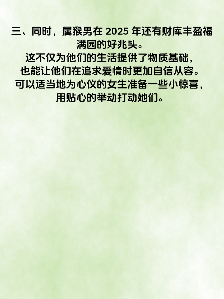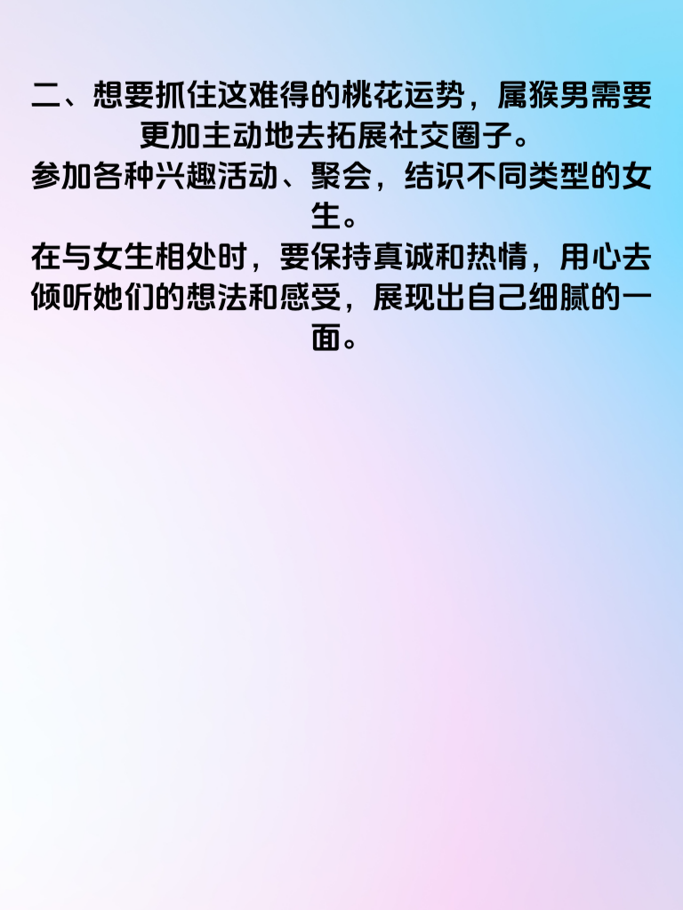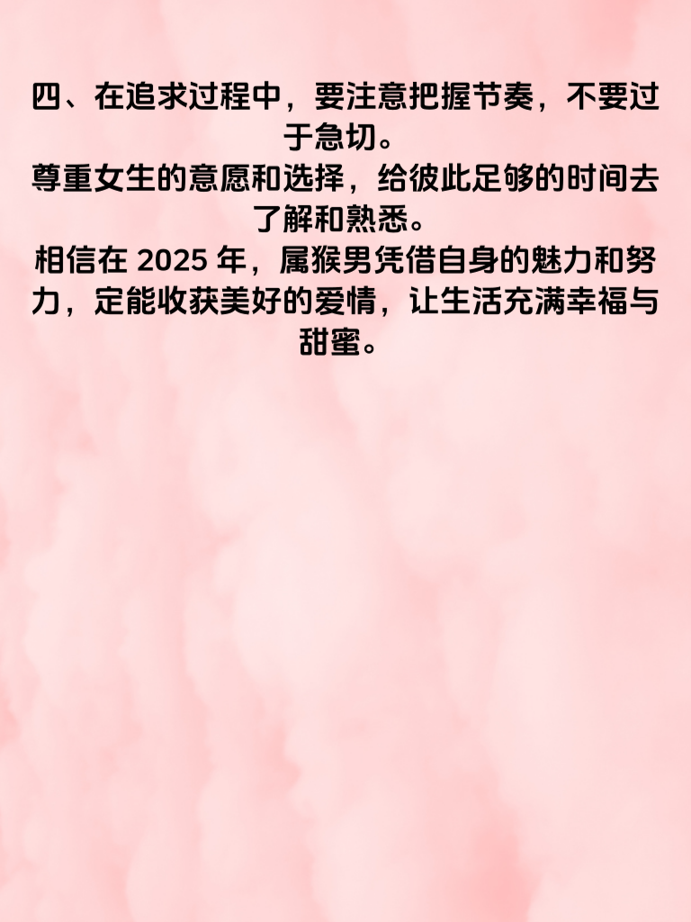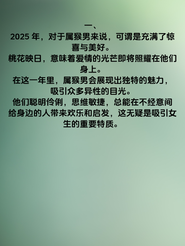 一、2025 年,对于属猴男来说,可谓是充满了惊喜与美好。桃花映日,意味着爱情的光芒即将照耀在他们身上。在这一年里,属猴男会展现出独特的魅力,吸引众多异性的目光。他们聪明伶俐,思维敏捷,总能在不经意间给身边的人带来欢乐和启发,这无疑是吸引女生的重要特质。 二、想要抓住这难得的桃花运势,属猴男需要更加主动地去拓展社交圈子。参加各种兴趣活动、聚会,结识不同类型的女生。在与女生相处时,要保持真诚和热情,用心去倾听她们的想法和感受,展现出自己细腻的一面。 三、同时,属猴男在 2025 年还有财库丰盈福满园的好兆头。这不仅为他们的生活提供了物质基础,也能让他们在追求爱情时更加自信从容。可以适当地为心仪的女生准备一些小惊喜,用贴心的举动打动她们。 四、在追求过程中,要注意把握节奏,不要过于急切。尊重女生的意愿和选择,给彼此足够的时间去了解和熟悉。相信在 2025 年,属猴男凭借自身的魅力和努力,定能收获美好的爱情,让生活充满幸福与甜蜜。