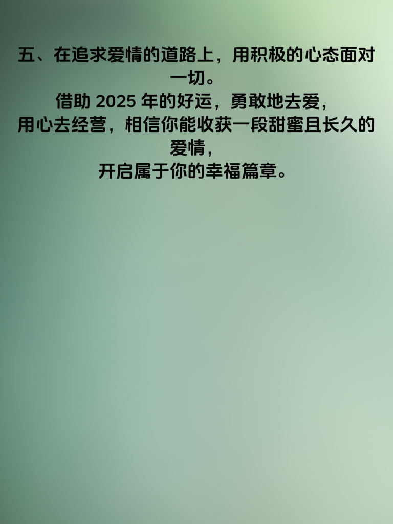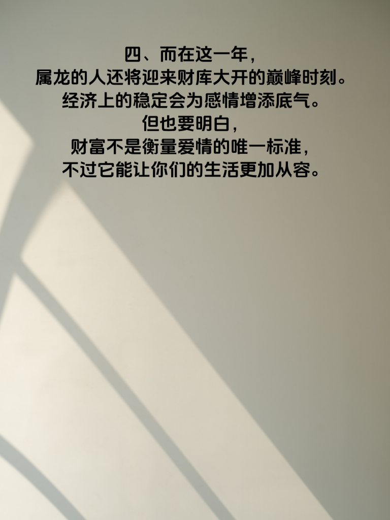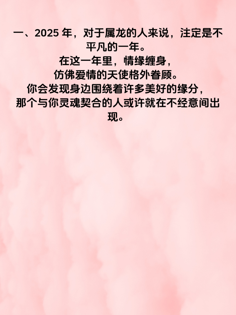 一、2025 年,对于属龙的人来说,注定是不平凡的一年。在这一年里,情缘缠身,仿佛爱情的天使格外眷顾。你会发现身边围绕着许多美好的缘分,那个与你灵魂契合的人或许就在不经意间出现。 二、要抓住这些情缘,男生们可得用心了。首先,展现真实的自己很重要。不要刻意伪装,真诚是打动女生的第一把钥匙。在她面前,大方地分享你的喜怒哀乐,让她看到最本真的你。 三、同时,注重细节能加分不少。比如记住她的喜好,在特殊的日子送上贴心的小礼物。一起相处时,耐心倾听她说话,用专注的眼神给予她回应,让她感受到你的在乎。 四、而在这一年,属龙的人还将迎来财库大开的巅峰时刻。经济上的稳定会为感情增添底气。但也要明白,财富不是衡量爱情的唯一标准,不过它能让你们的生活更加从容。 五、在追求爱情的道路上,用积极的心态面对一切。借助 2025 年的好运,勇敢地去爱,用心去经营,相信你能收获一段甜蜜且长久的爱情,开启属于你的幸福篇章。