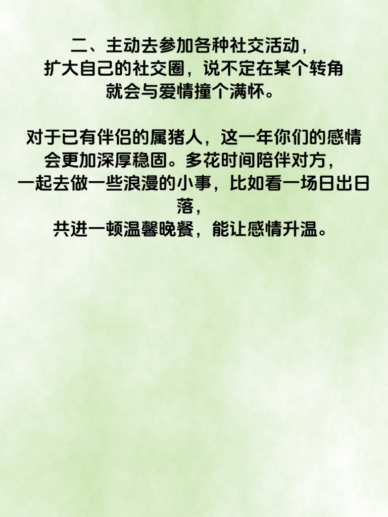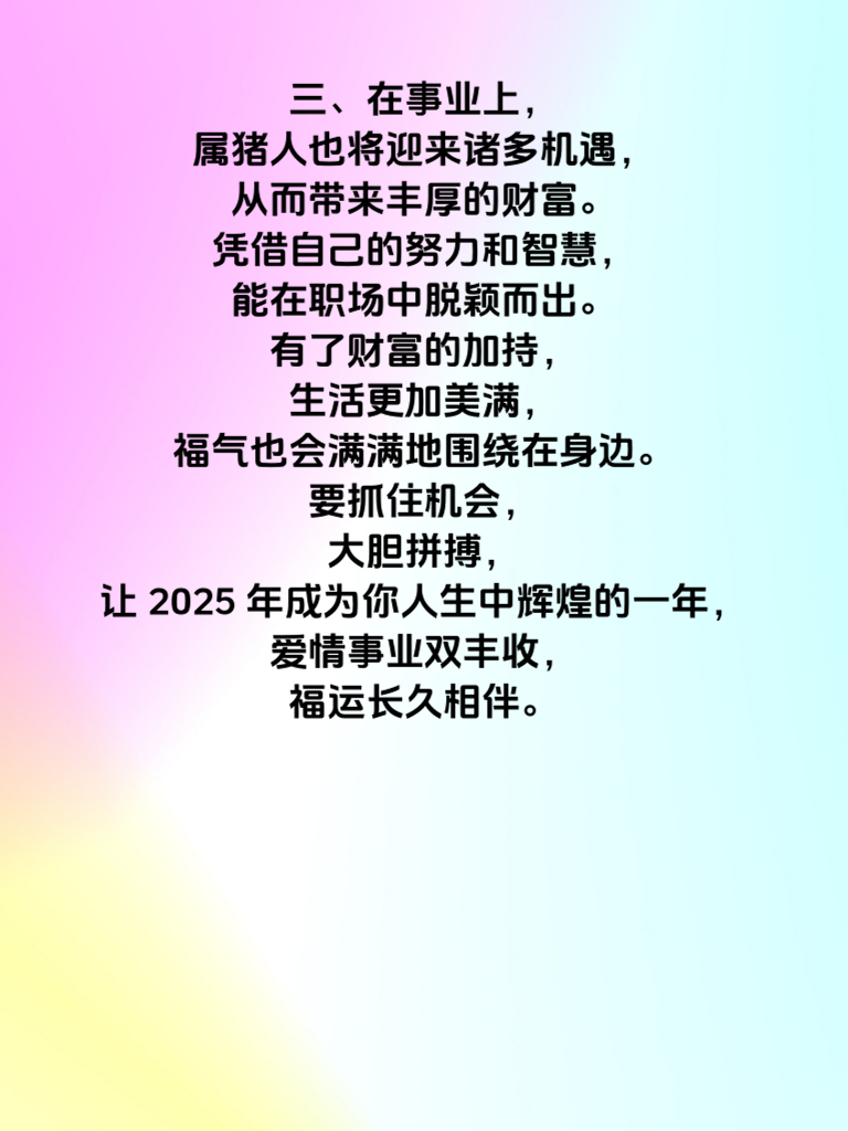 一、属猪的朋友们在2025年可谓是运势如虹,情场得意,财源广进福满门。在感情方面,这一年是绝佳的收获期。单身的属猪人,会遇到那个让你心动的灵魂伴侣。你只需保持积极乐观的心态,勇敢地展现自己的魅力。 二、主动去参加各种社交活动,扩大自己的社交圈,说不定在某个转角就会与爱情撞个满怀。对于已有伴侣的属猪人,这一年你们的感情会更加深厚稳固。多花时间陪伴对方,一起去做一些浪漫的小事,比如看一场日出日落,共进一顿温馨晚餐,能让感情升温。 三、在事业上,属猪人也将迎来诸多机遇,从而带来丰厚的财富。凭借自己的努力和智慧,能在职场中脱颖而出。有了财富的加持,生活更加美满,福气也会满满地围绕在身边。要抓住机会,大胆拼搏,让2025年成为你人生中辉煌的一年,爱情事业双丰收,福运长久相伴。