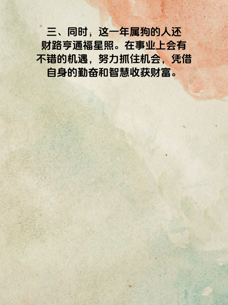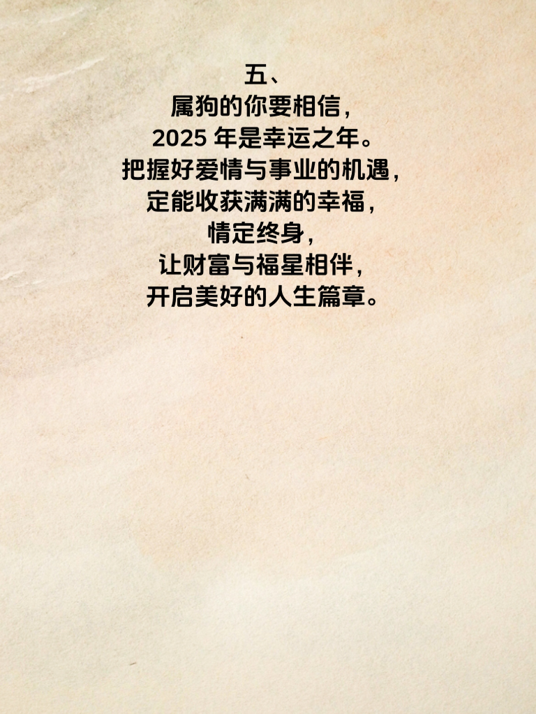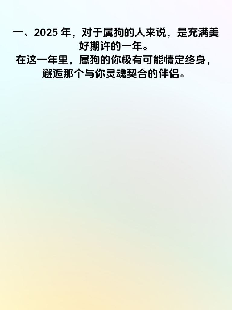 一、2025 年,对于属狗的人来说,是充满美好期许的一年。在这一年里,属狗的你极有可能情定终身,邂逅那个与你灵魂契合的伴侣。 二、追求爱情时,要展现出属狗人忠诚、可靠的特质。真诚对待对方,用心去聆听她的想法和感受,让她感受到你的真心实意。 三、同时,这一年属狗的人还财路亨通福星照。在事业上会有不错的机遇,努力抓住机会,凭借自身的勤奋和智慧收获财富。 四、而在情感与财富双丰收的背后,是你积极向上的生活态度。保持乐观,用正能量去感染身边人,也会吸引到更优秀的伴侣。 五、属狗的你要相信,2025 年是幸运之年。把握好爱情与事业的机遇,定能收获满满的幸福,情定终身,让财富与福星相伴,开启美好的人生篇章。