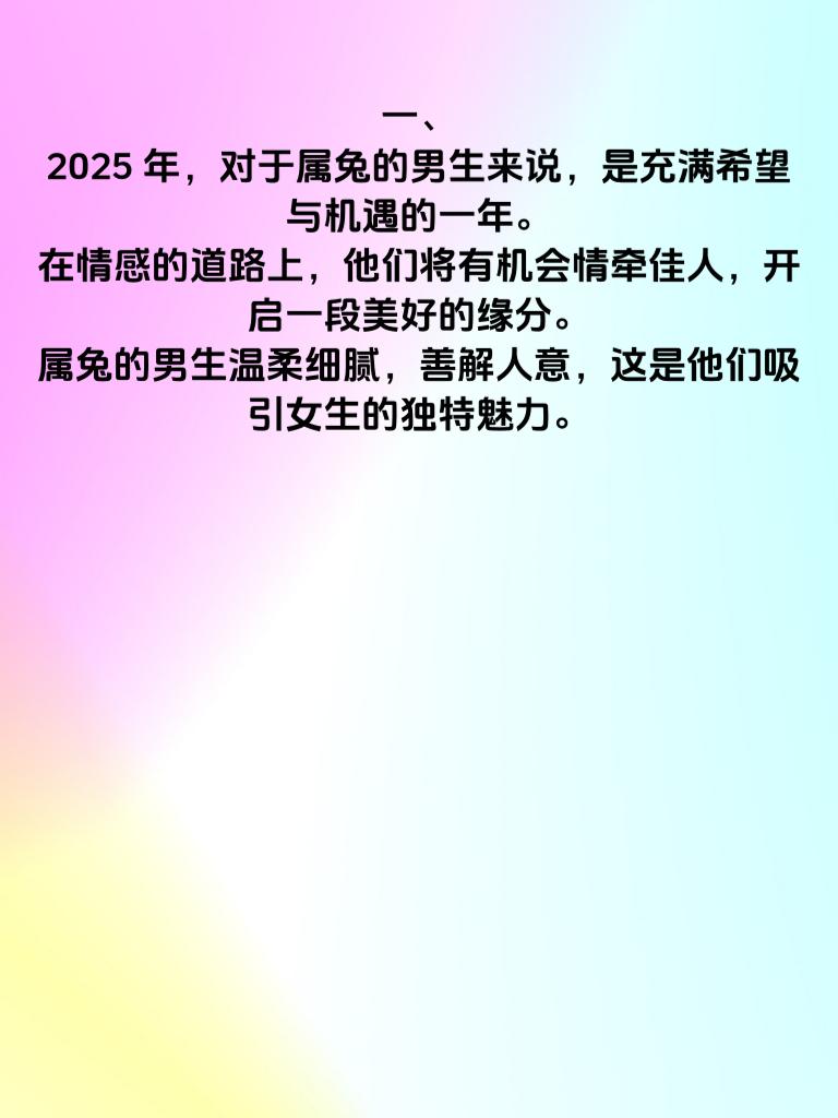 一、2025 年,对于属兔的男生来说,是充满希望与机遇的一年。在情感的道路上,他们将有机会情牵佳人,开启一段美好的缘分。属兔的男生温柔细腻,善解人意,这是他们吸引女生的独特魅力。 二、追求女生时,真诚是必杀技。要让她感受到你内心的真实情感,不做作,不虚伪。在日常相处中,多关心她的生活点滴,她生病时的一句问候,她遇到困难时的一个肩膀,都能温暖她的心。 三、同时,展现你的上进心也至关重要。让她看到你对未来有清晰的规划,并且正在为之努力奋斗。2025 年,财路渐宽新启程,这种积极向上的态度会让她对你更有信心。 四、制造一些浪漫的时刻也必不可少。不需要奢华的礼物,一次温馨的散步,一场精心准备的野餐,都能为你们的感情升温。属兔的男生凭借自身的浪漫细胞,定能为心仪的女生创造难忘的回忆,从而在 2025 年收获美好的爱情,踏上幸福的旅程。