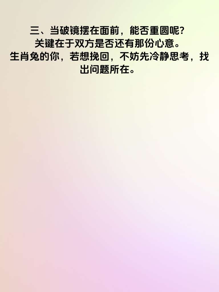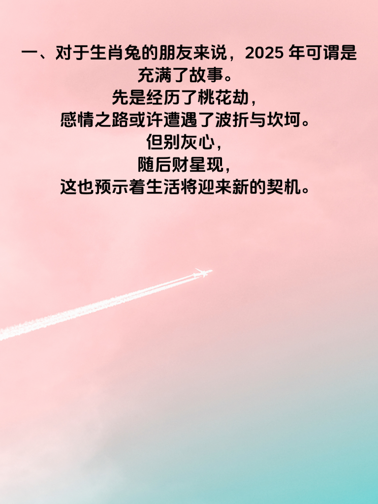 一、对于生肖兔的朋友来说,2025年可谓是充满了故事。先是经历了桃花劫,感情之路或许遭遇了波折与坎坷。但别灰心,随后财星现,这也预示着生活将迎来新的契机。 二、在感情中,桃花劫可能意味着一些误会、争吵或者外界的干扰,让原本美好的关系出现裂痕。然而,这也是一次考验彼此的机会。 三、当破镜摆在面前,能否重圆呢?关键在于双方是否还有那份心意。生肖兔的你,若想挽回,不妨先冷静思考,找出问题所在。 四、主动沟通是关键。真诚地表达自己的感受和想法,倾听对方的心声。同时,反思自己在之前感情中的不足,努力改进。 五、展现自己的改变和成长,让对方看到你的决心。用行动去证明你对这份感情的珍视,也许就能迎来破镜重圆的美好结局,开启感情与生活的新篇章。