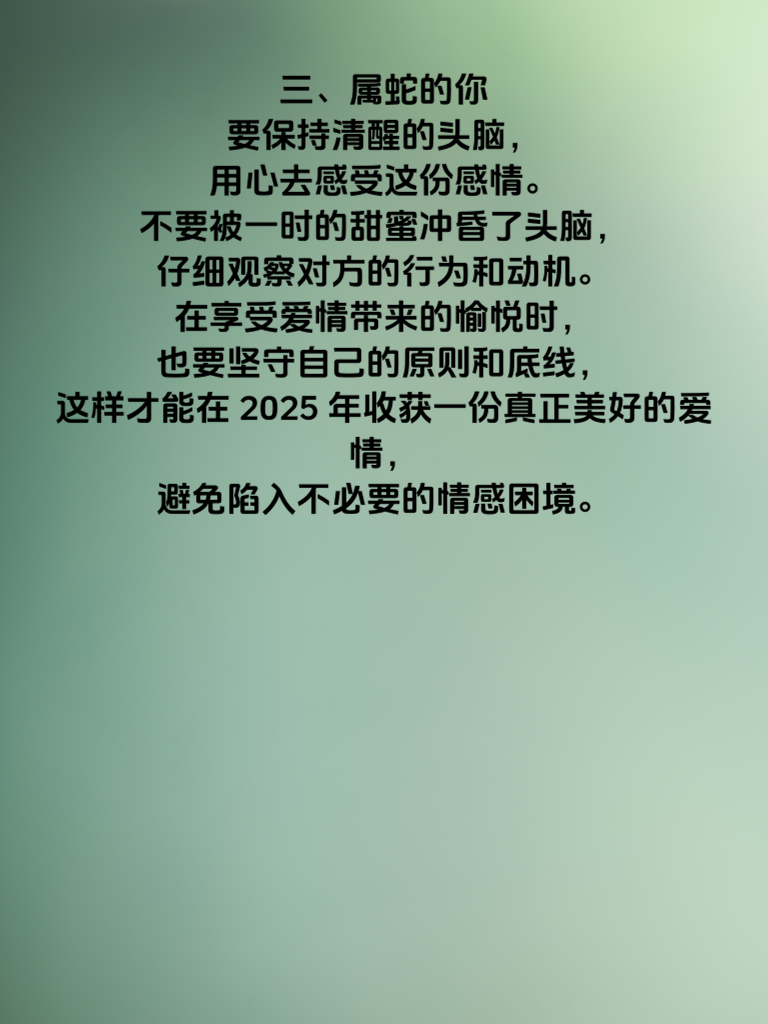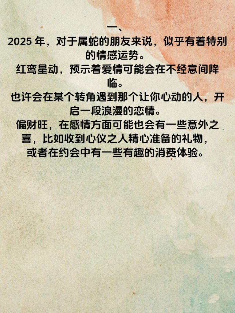 一、2025年,对于属蛇的朋友来说,似乎有着特别的情感运势。红鸾星动,预示着爱情可能会在不经意间降临。也许会在某个转角遇到那个让你心动的人,开启一段浪漫的恋情。偏财旺,在感情方面可能也会有一些意外之喜,比如收到心仪之人精心准备的礼物,或者在约会中有一些有趣的消费体验。 二、然而,在享受甜蜜的同时,也要警惕“甜蜜陷阱”。有时候,爱情初期的美好容易让人迷失,可能会出现一些看似甜蜜却隐藏着问题的情况。比如对方过度的热情,可能背后有着不为人知的目的;又或者一些看似浪漫的举动,实则是为了掩盖某些矛盾。 三、属蛇的你要保持清醒的头脑,用心去感受这份感情。不要被一时的甜蜜冲昏了头脑,仔细观察对方的行为和动机。在享受爱情带来的愉悦时,也要坚守自己的原则和底线,这样才能在2025年收获一份真正美好的爱情,避免陷入不必要的情感困境。