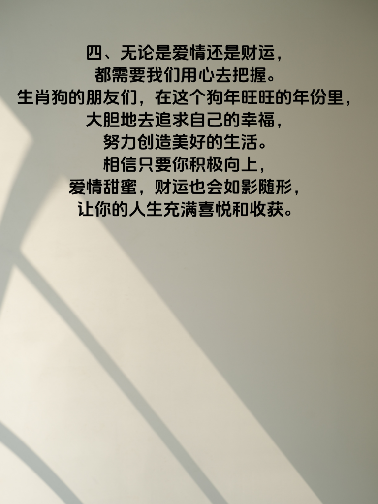 一、2025 年,生肖狗的朋友们迎来了属于自己的旺年。在爱情方面,甜蜜的气息正悄然弥漫。对于单身的属狗男女来说,这是一个绝佳的脱单时机。要相信爱情会在不经意间降临,保持积极乐观的心态,主动去拓展自己的社交圈子,多参加一些有趣的活动,说不定就能遇到那个让你心动的人。 二、而对于已经有伴侣的属狗人,这一年爱情会更加稳固。用心去经营感情,多一些理解和包容。在特殊的日子里,精心准备一份小惊喜,比如亲手为对方做一顿浪漫的晚餐,或者送上一份贴心的礼物,能让感情升温不少。记住,沟通是感情的桥梁,多和伴侣分享生活中的喜怒哀乐,增进彼此的了解。 三、财运方面,2025 年生肖狗也有着不错的运势。在职场上,要积极主动,勇于展现自己的能力,抓住每一个可能的机会,说不定就能收获一笔丰厚的奖金。同时,合理规划自己的收支,避免不必要的消费,让财富积累得更加稳健。 四、无论是爱情还是财运,都需要我们用心去把握。生肖狗的朋友们,在这个狗年旺旺的年份里,大胆地去追求自己的幸福,努力创造美好的生活。相信只要你积极向上,爱情甜蜜,财运也会如影随形,让你的人生充满喜悦和收获。