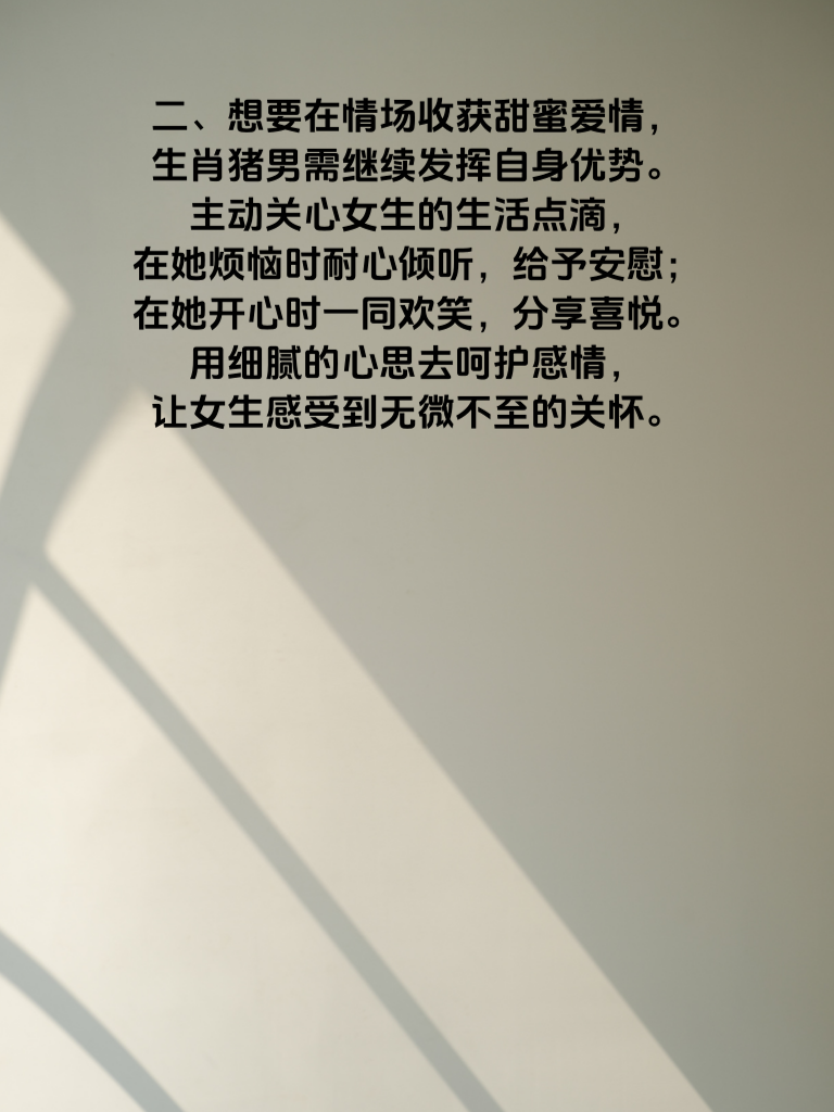一、2025 年对于生肖猪男来说,可谓是充满了惊喜与好运。情场之上桃花盛开,爱情运势一路飘红。生肖猪男本就性格温和,待人友善,在这一年更是魅力大增。他们真诚的态度如同温暖的阳光,能轻易地融化女生心中的坚冰。 二、想要在情场收获甜蜜爱情,生肖猪男需继续发挥自身优势。主动关心女生的生活点滴,在她烦恼时耐心倾听,给予安慰;在她开心时一同欢笑,分享喜悦。用细腻的心思去呵护感情,让女生感受到无微不至的关怀。 三、而且这一年生肖猪男的财运也十分可观,财源滚滚来。良好的经济基础能为感情增添更多保障。可以用财富为心爱的人制造浪漫惊喜,送她心仪已久的礼物,带她去向往的地方旅行,让爱情在物质的滋养下更加甜蜜。 四、不过,感情不仅仅靠运势和物质。生肖猪男要始终保持真诚与努力,不断提升自己,让自己成为更优秀的伴侣。如此,在 2025 年,他们定能在情场收获美满爱情,同时事业上也能因财气助力,迈向成功,实现情场桃花红,财源滚滚来的美好愿景。