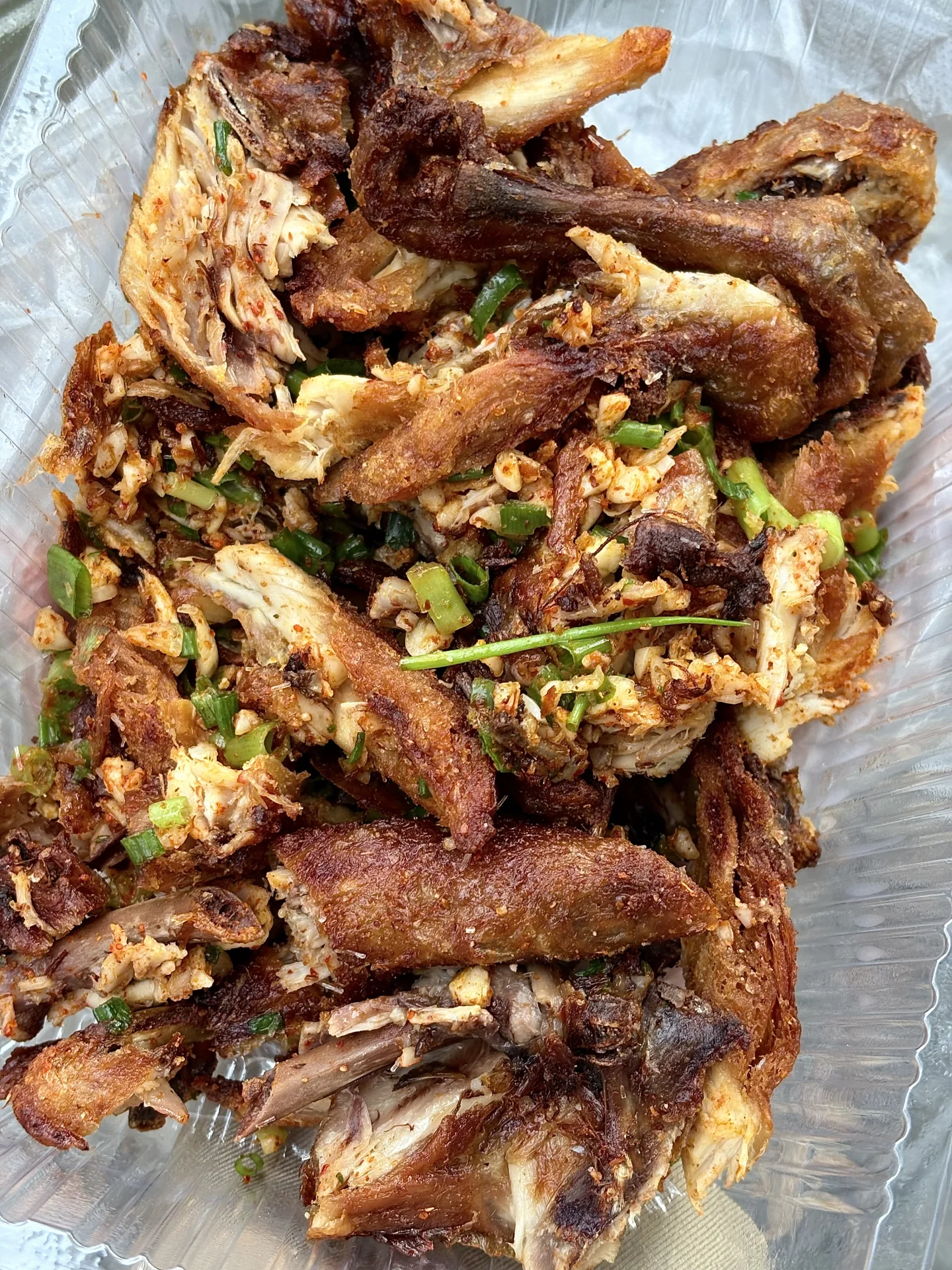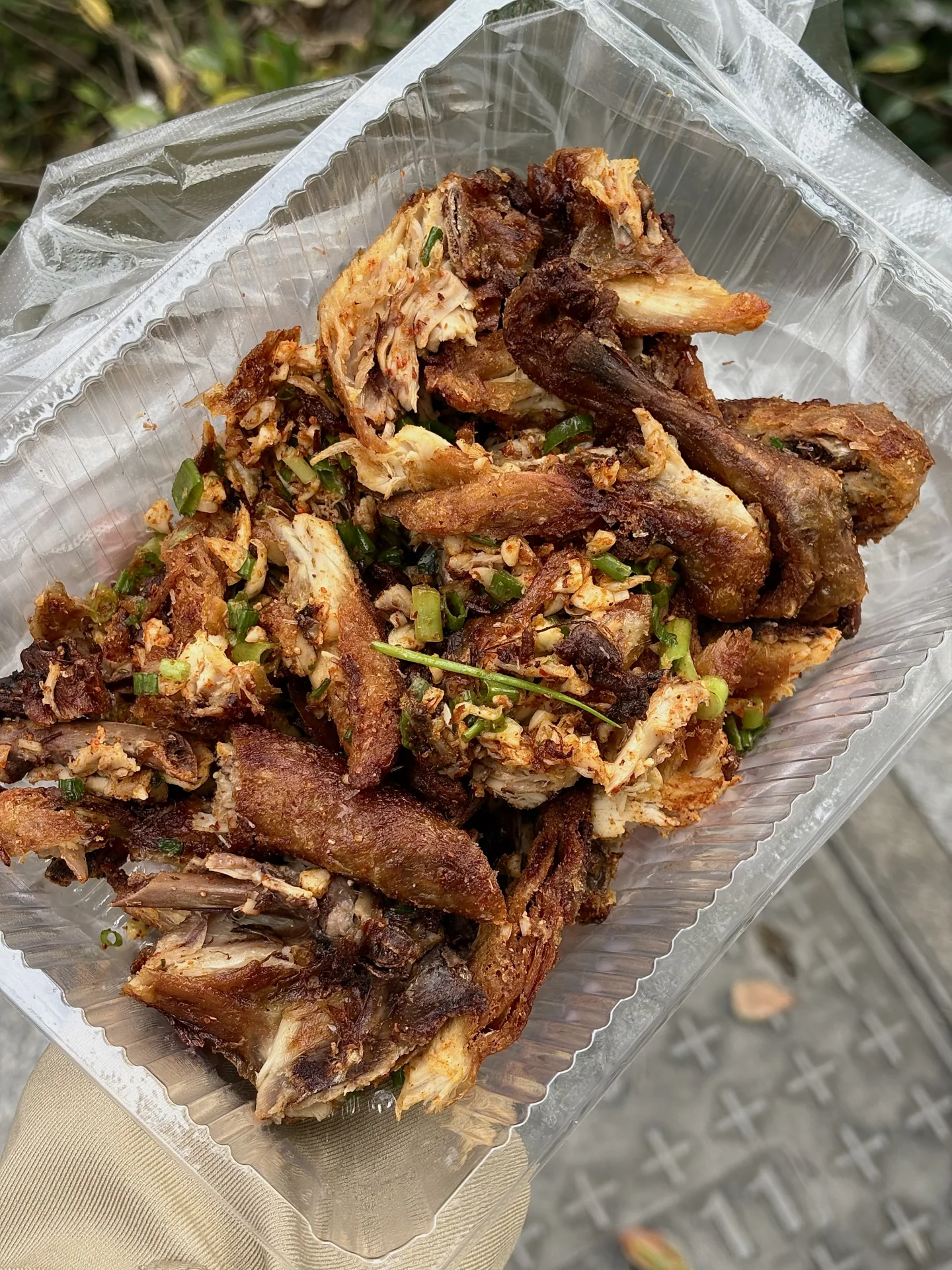 在一家菜市场旁边 来买的居民应该也挺多的 鸡肉都是现炸的 炸完还会加葱花蒜泥辣椒粉调味 超级香 拿到手一定要趁热吃 鸡肉很入味 炸的很透 干香型 无比的酥脆!!! 终于可以理解为什么这么多人排队也要来吃了