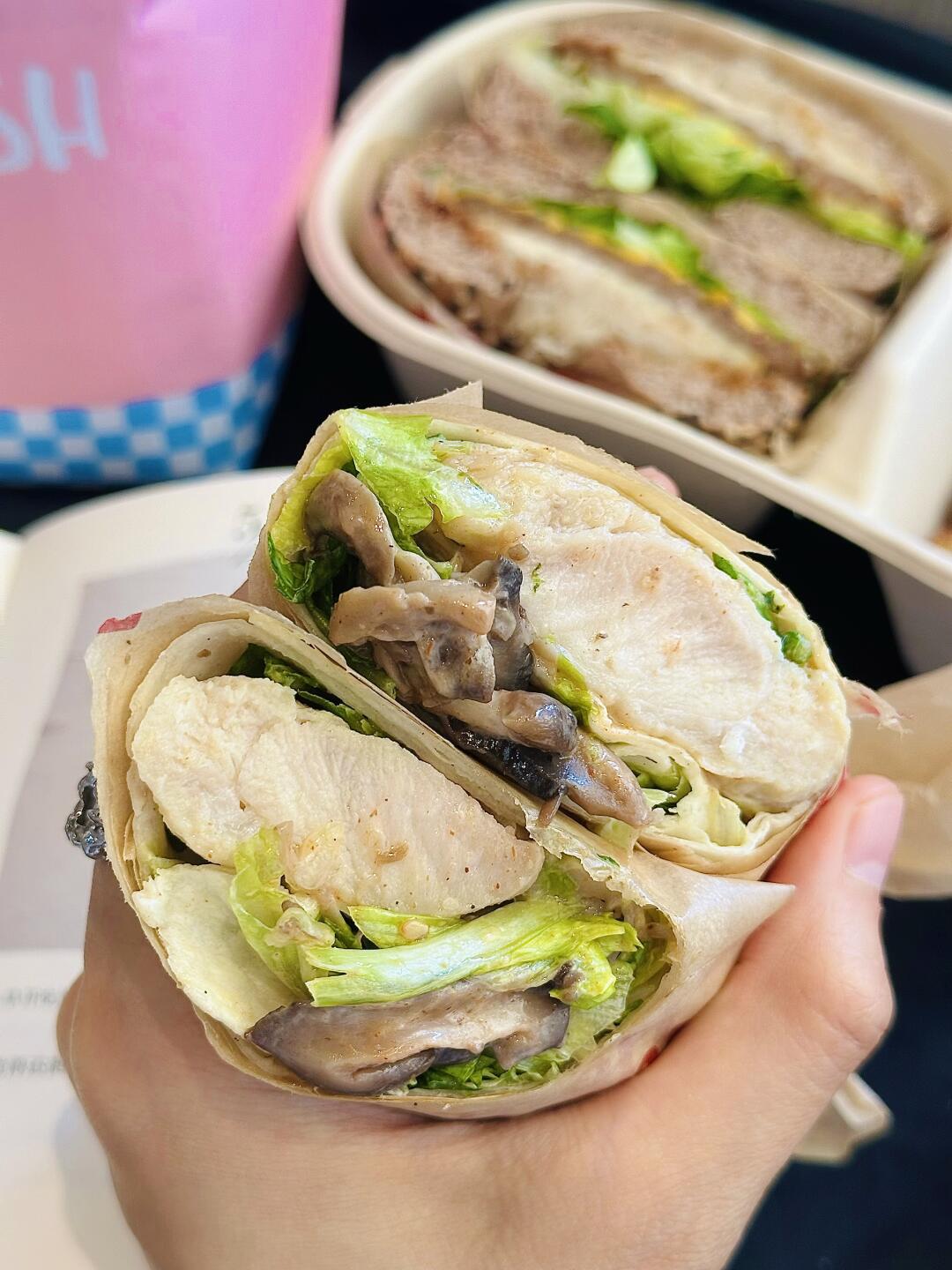 菌菇鸡腿肉蔬菜卷,咬开里面有一大块鸡腿肉搭配多多的蔬菜,香菇鲜嫩多汁,吃起来香香辣辣的,一卷下去真是卷走一天的内卷焦虑~而且卷卷系列首次加入轻体午餐盒,以后不止有堡还有卷,每一样都是心头爱。以后一杯咖啡钱就能吃到三份营养,超值超赞
