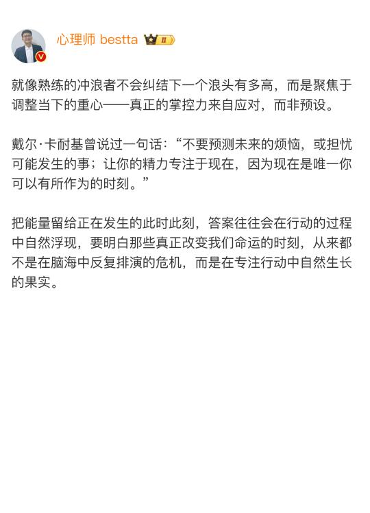 埃克哈特·托利说过一句话:“接纳当下的无法改变,改变当下的可以把握。”把能量留给正在发生的此时此刻,答案往往会在行动的过程中自然浮现。