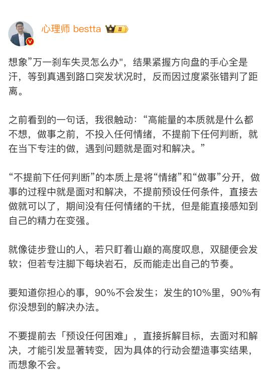 就像我之前看到的一句话:“高能量的本质就是什么都不想,做事之前,不投入任何情绪,不提前下任何判断,就在当下专注的做,遇到问题就是面对和解决。”