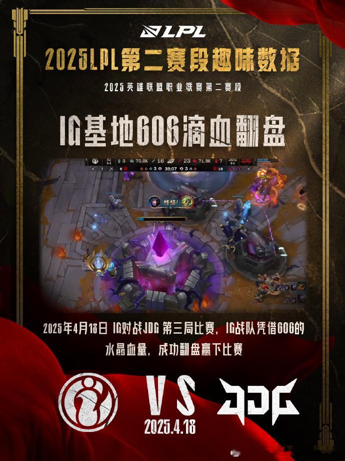 时隔2211天,IG再次丝血翻盘:4月18日 vs 第三小局,IG战队凭借606点水晶血量,高地团战极限翻盘,最终赢下比赛;此役IG战队刷新了2025LPL第二赛段常规赛组内赛中,在两座门牙塔皆破情况以及在最少基地水晶血量的情况下翻盘获胜的记录!