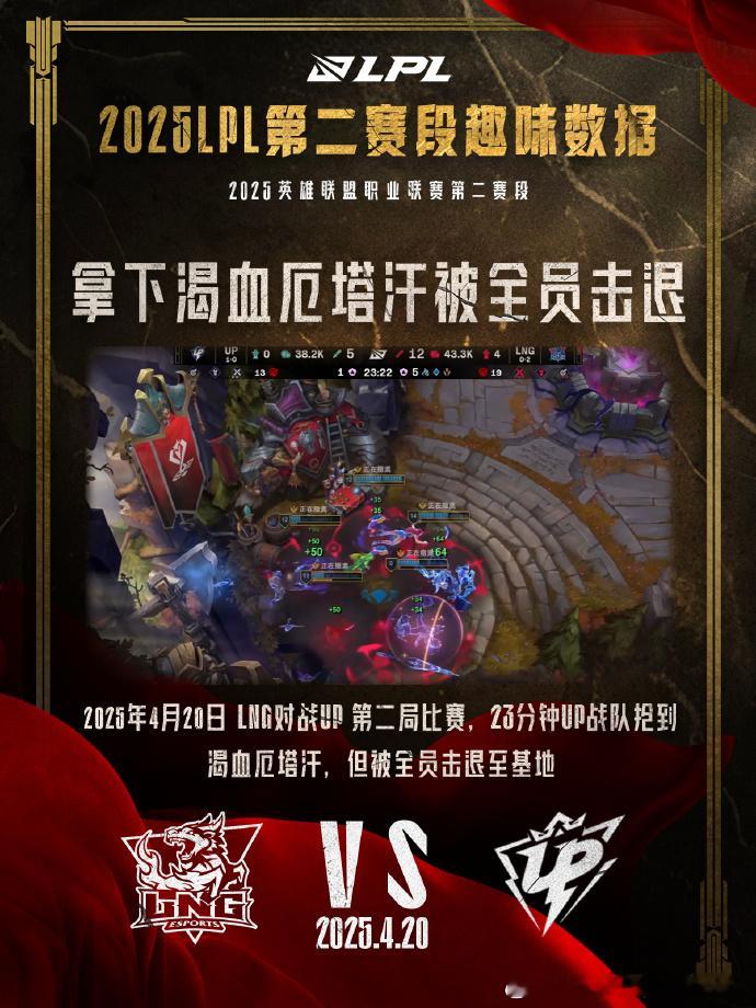 拿下渴血厄塔汗被全员击退:4月20日 vs 第二小局,23分钟UP战队抢到渴血厄塔汗,但被全员击退至基地。