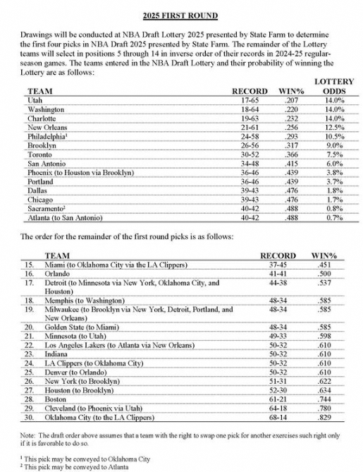 这是抽签顺序,也就是各支球队去抽自己签位的顺序。成绩最差的第一个去抽,也就是爵士,抽到哪个顺位就是哪个。比如爵士第一个抽,抽到状元就是状元签,抽到榜眼就是榜眼签。。以此类推。。