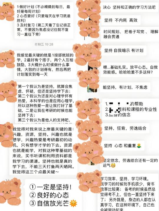 有人提到不焦虑,有人提到不要有压力,也有人提到不内耗,还有学妹很专业的提到了自我效能感,我更喜欢那句自信放光芒!只要每天在学习就是进步,只要每天进步一点点就开心,多表扬自己