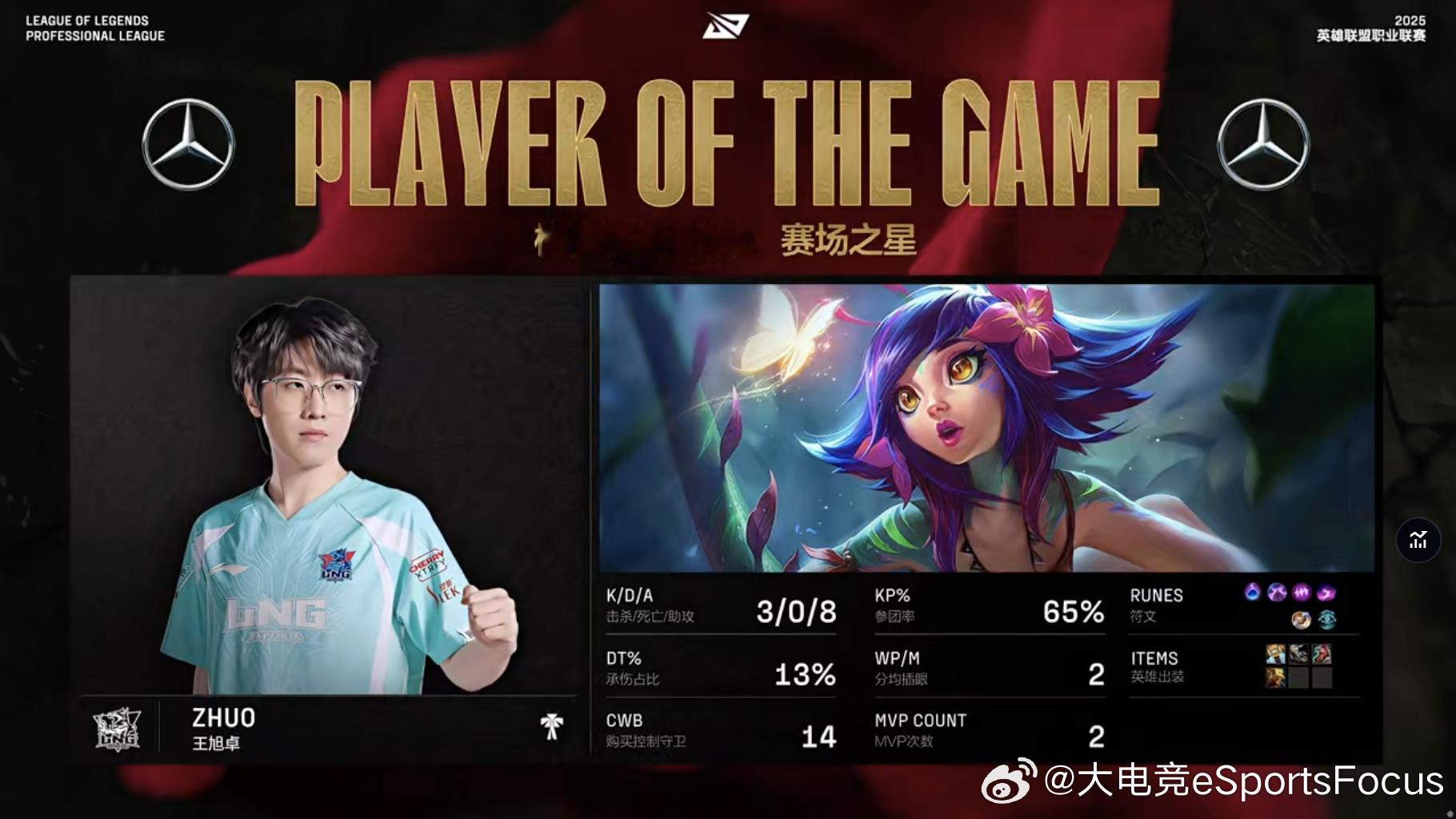 本场赛后数据,MVP再次给到Zhuo的妮蔻[酷]二连mvp