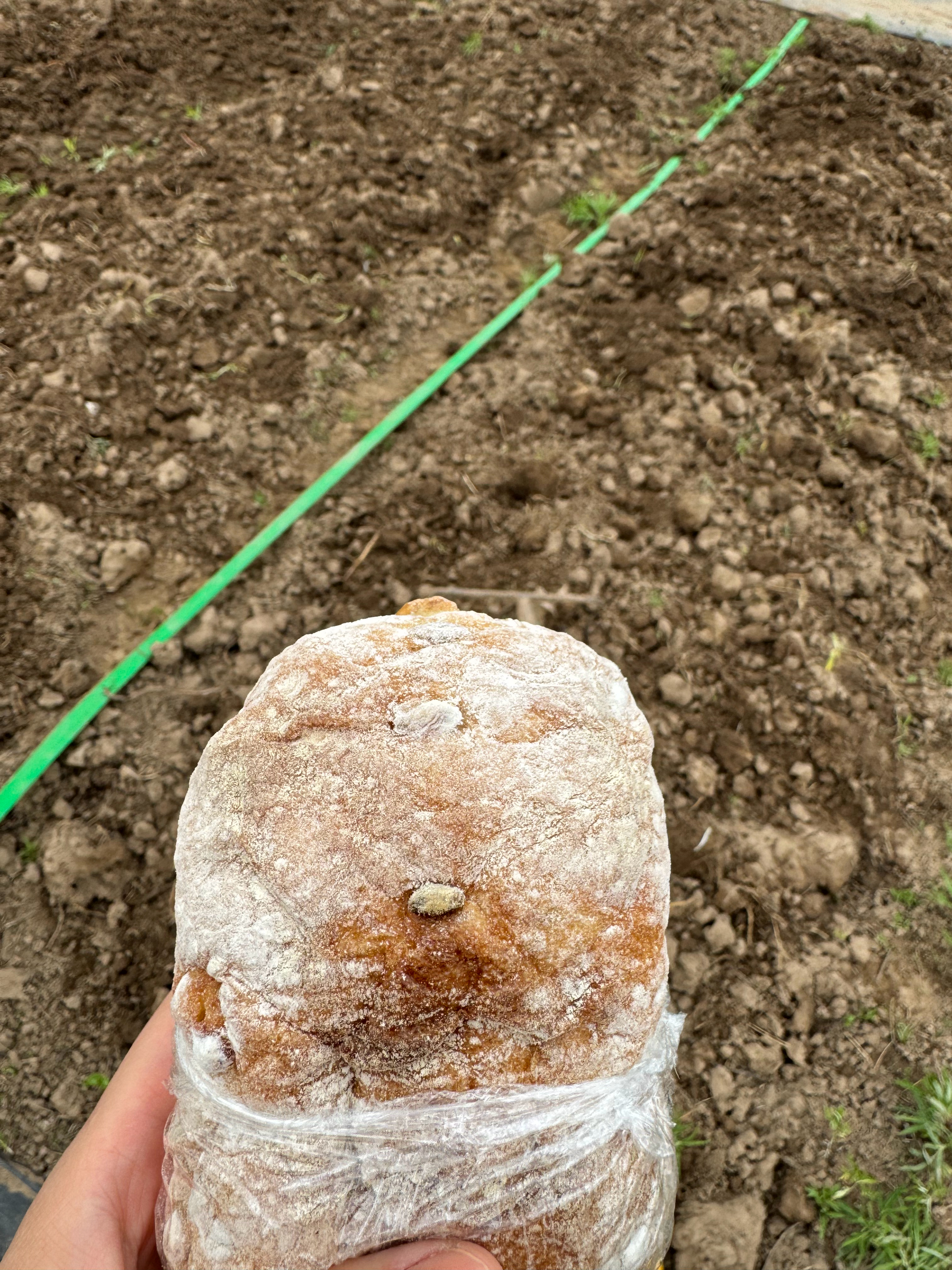 上次把地看错了,种子全撒到别人家的地里了。今天又来刨地重新撒种子。刨地一会就流了很多汗,种地挺难的。带了一个面包来,比在家里要好吃许多倍。