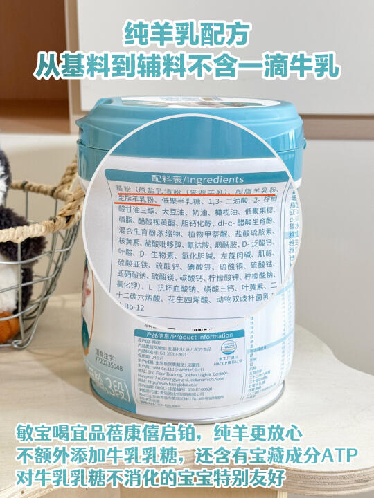 搭配纯羊乳配方,从基料到辅料不含一滴牛乳👍重要的是牛乳乳糖不消化的宝宝也能喝,里面不额外添加牛乳乳糖,还含有宝藏成分ATP,从源头就做到高品质守护!