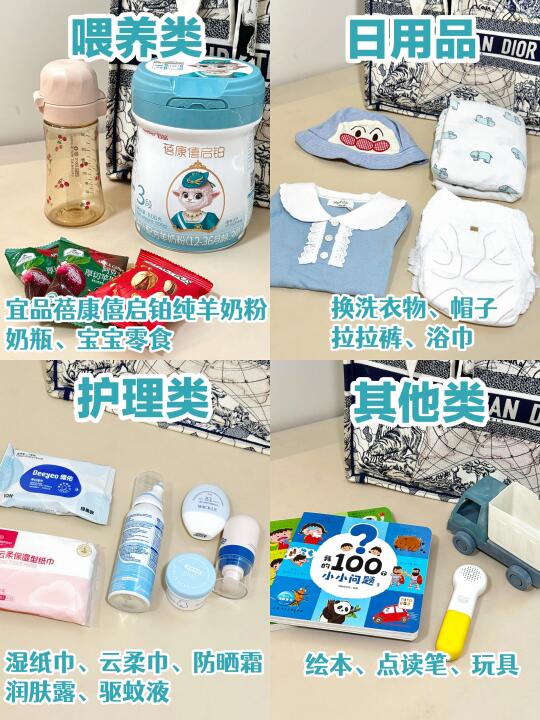 像日用品、护理类,我尽可能带小样或者分装,这样带娃出行精简又省事。但是宝宝的口粮,我可一点也不敢马虎。像我们家宝宝从小体质就带有小敏敏的buff,一到新环境容易不适应,而且跟着大人在外面胡吃海喝,容易闹肚肚。所以我做了好久的攻略,最终给宝宝选择的是“宜品蓓康僖启铂纯羊奶粉”