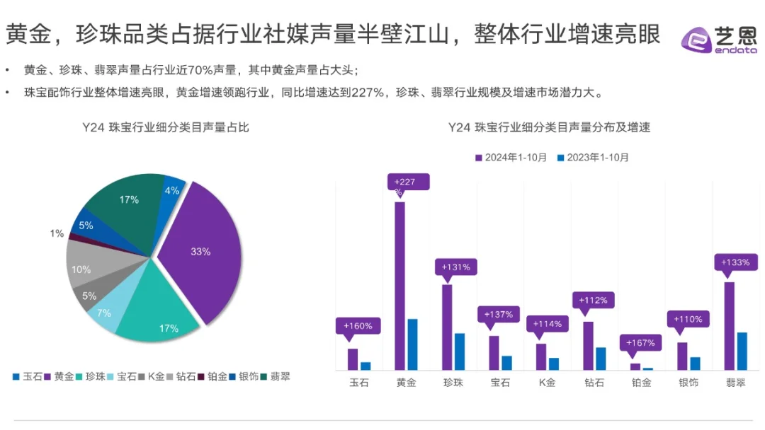 社媒热度攀升:珠宝配饰行业声量增长129%,互动量增长28%,显示出线上发展的迅猛势头。