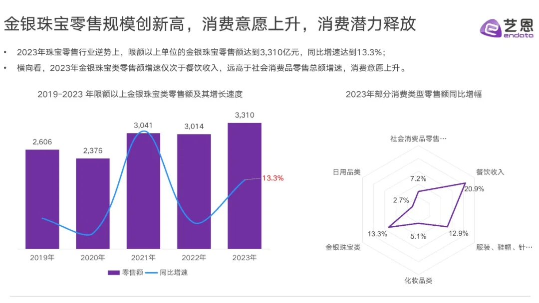 消费意愿上升:2023年金银珠宝类零售额同比增速达到13.3%,显示出强劲的消费潜力。