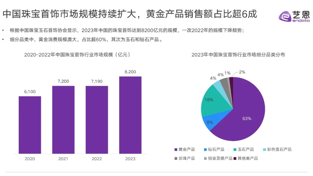 市场规模扩大:2023年中国珠宝首饰市场规模达到8200亿元,黄金消费规模庞大,占比超60%。
