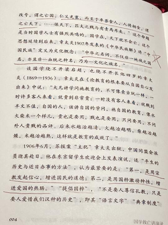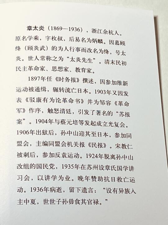 [打卡R]这是“章疯子”的临终遗言。 [打卡R]章太有名了,名气又大又狂妄。名气大,因为是国学大师;狂妄,是对清廷,对袁世凯,对蒋介石等官僚阶层。 他又是可爱的,对青年学生很友好。甚至杜月笙假司马迁写游侠列传,邀他为自己写传,也能哄得过。 然而从历史上传下来,似乎这些标签过重,而忽略了他本身是“国学大师”这一最大特质。 这本《国学救亡演讲录》,收录了他在经史儒等维度,对传统国学的解读,又能感受到他与时俱进,通过国学呼吁爱国救亡,读下来既能学习知识,又能感受到这个奇人的爱国情怀!
