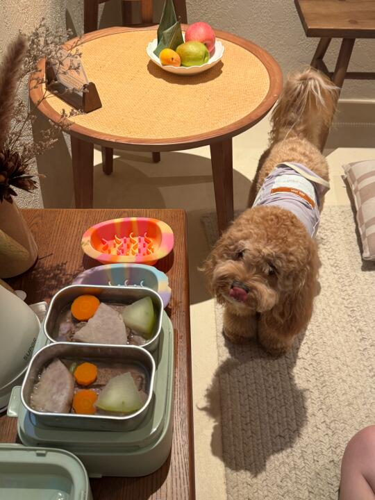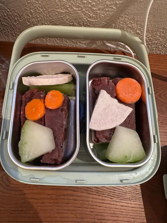 让我来看看是哪个小狗出去玩 还能吃上热乎乎的狗饭呀 噢 是我的小狗 小狗吃得开心妈妈忙得飞起 平时吃的狗饭食材日一声打碎 按每顿份量分装冷冻好 懒得焯水所以带了可以丢进去蒸的蔬菜 直接一锅出 就是开锅需要冷却很久 把孩子急得团团转