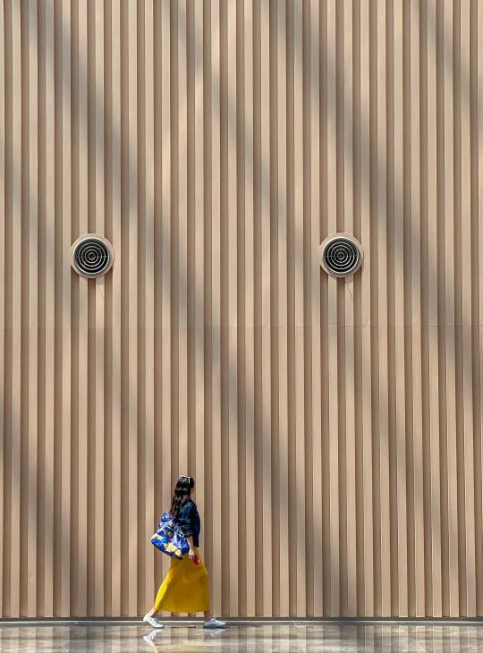 模特站在访客中心北向电梯墙,在光影墙自然走动。