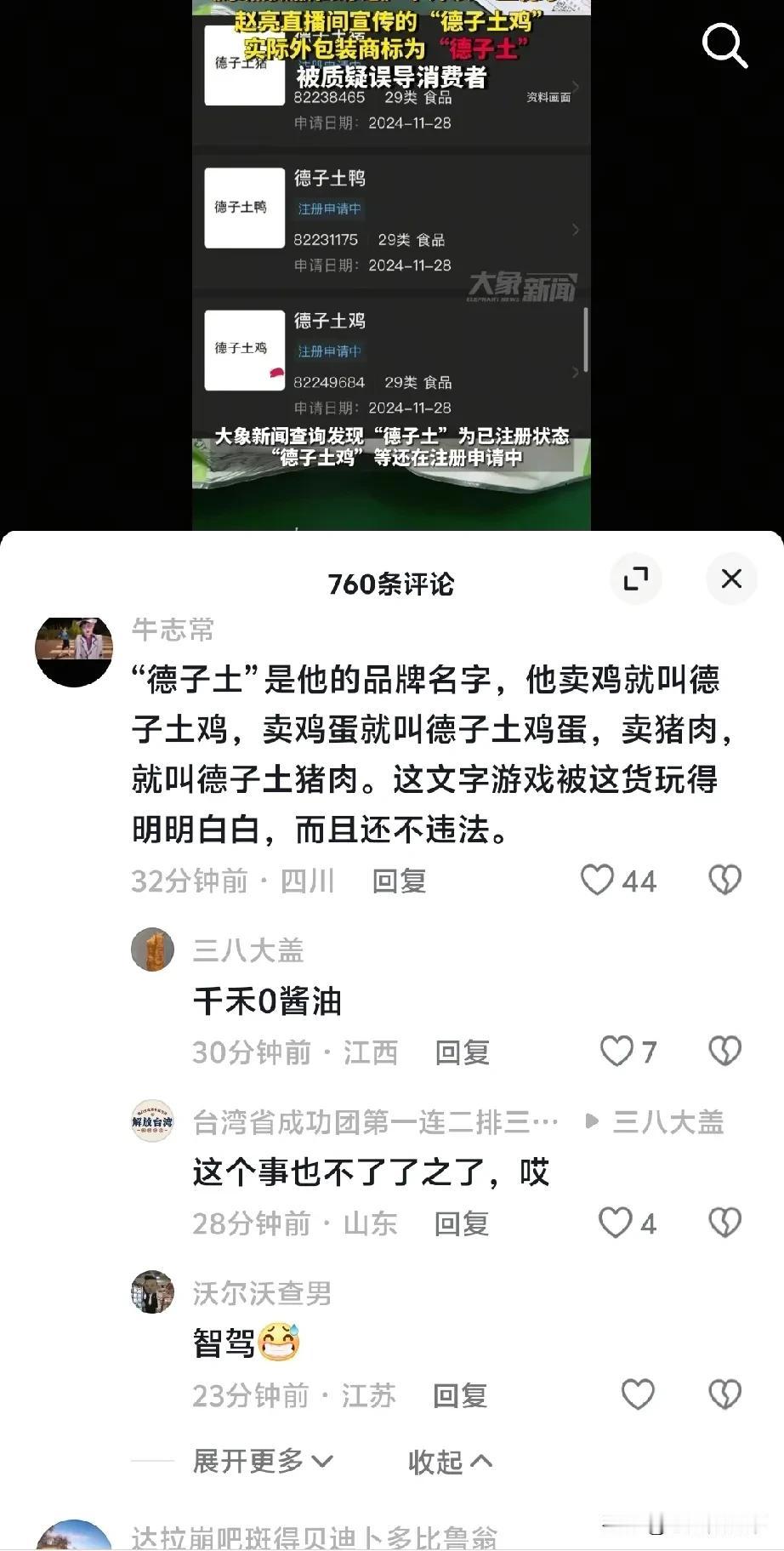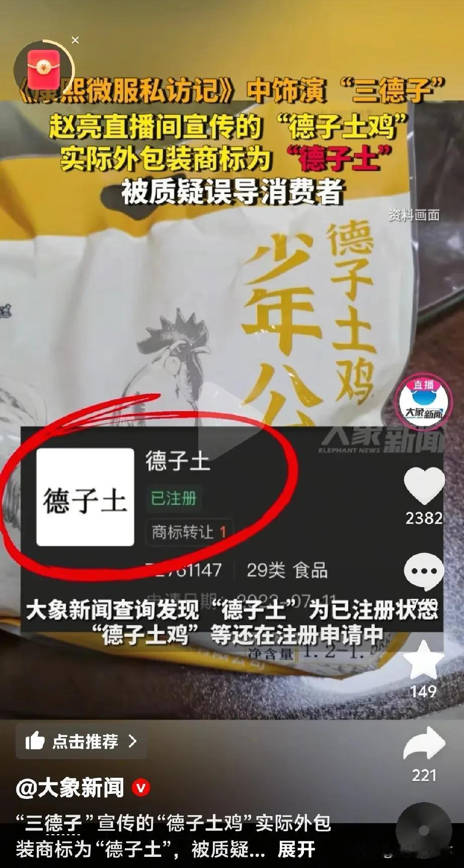 在胖堵来风波中,三德子为什么第一时间选择道歉,也许这就是原因! 三德子也没想到,他因此却摊上事了。 三德子现在也是近百万的博主了,三德子旗舰店的介绍,主要经营的是土鸡、散养鸡,而且定价也并不便宜。 但是,在别人眼里他卖的是“德子”土鸡,而实际上却是“德子土”鸡,[尬笑] 没想到吧!德子土鸡的商标不是“德子”,也不是“德子土鸡”,而是“德子土”! 看看他所受的商品的包装,角标®的前面才是商标名“德子土” 据三德子介绍他卖一只鸡只赚1.5元,其余的利润都分给了他的员工……难道他养鸡纯粹是为了做慈善?但是可信度又在哪? 悉知,真诚才是必杀技! 一个连商标名都能取巧的团队,当真诚不在,你所销售的产品的质量又能怎样去取信于人呢?你的慈善…… 胖东来 三德子土鸡