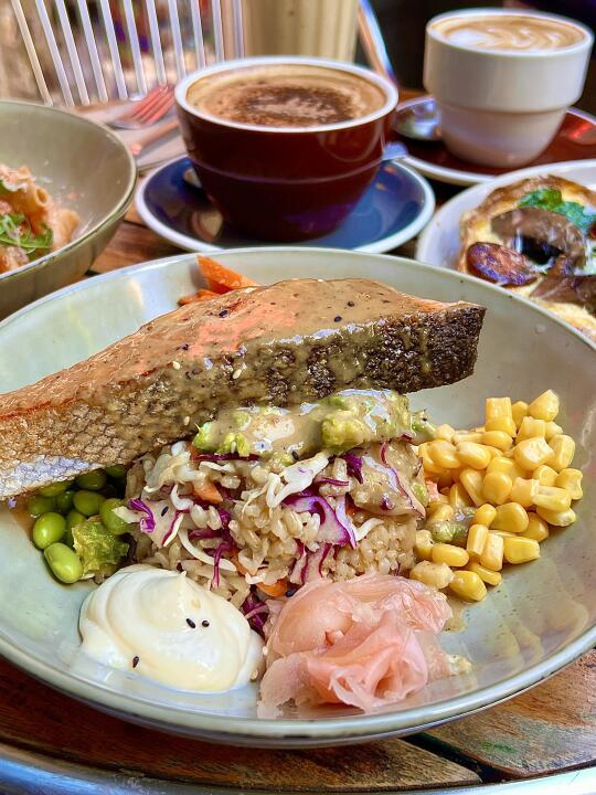 香煎三文鱼搭配营养满满的糙米饭,口感清爽,酱汁调配恰到好处,味道不错。