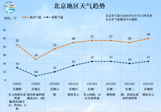 ❤️根据北京发布,北京市气象台5月8日11时发布的天气预报,今天下午多云转阴,傍晚有分散性雷阵雨,南风三级左右,阵风五六级,最高气温25℃;夜间阴有小到中雨,伴有雷电,南转北风二级左右,最低气温13℃。