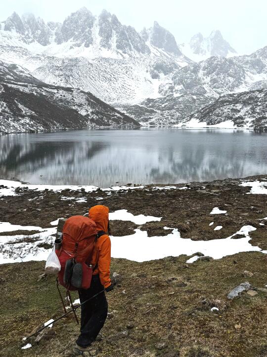 这次徒步阿布吉措天气不太理想,刮风又下雪!穿的骆驼喜马拉雅冲锋衣H5500,扛住了高海拔4000多的风雪考验,采用的是纳米级别的双组份ePTFE透汽膜,33550mmH2O的防水指数,让我在无雨衣保护情况下也没有湿透到内部,很有安全感。