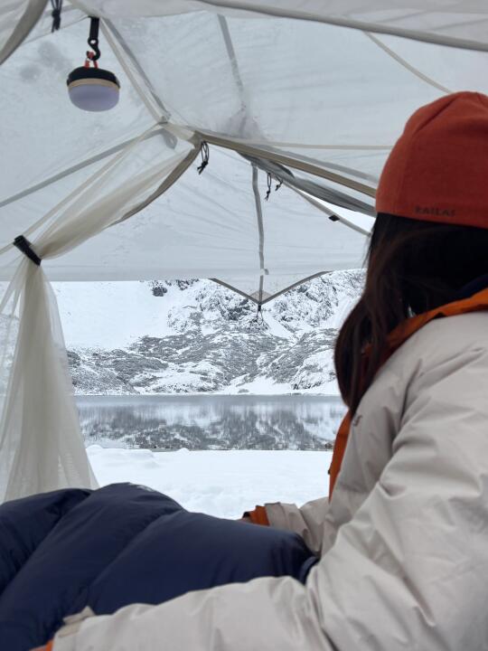 上次雪地露营只有蛋巢+铝膜一晚上背部都凉飕飕地,这次加了气垫很暖和