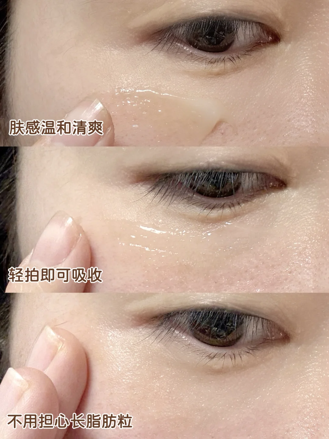 轻盈的凝霜质地,上脸一抹就化开了,根本不用担心会厚重黏腻。像我在熬完夜之后就会厚涂它再打圈按摩吸收,能够感觉眼周特别透亮,细纹就像是被一双无形大手给抚平了一般,甚至连以前扎根在我眼底的顽固纹都淡化不少,眼周变得嘭弹又紧致,合照都很显年轻,就连熬夜遗留下来的黑眼圈都淡了很多,偶尔一两天熬上夜了,也不会一晚就成为熊猫眼。