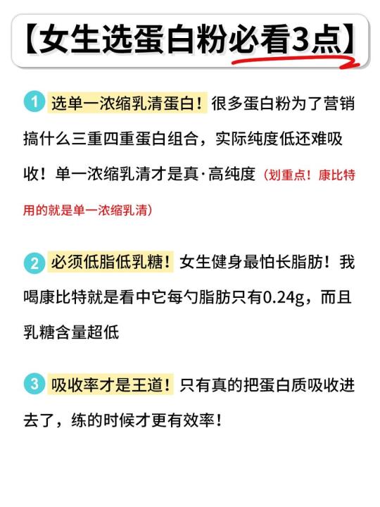 1️⃣ 选单一浓缩乳清蛋白!很多蛋白粉为了营销搞什么三重四重蛋白组合,实际纯度低还难吸收!单一浓缩乳清才是真·高纯度(划重点!康比特用的就是单一浓缩乳清)