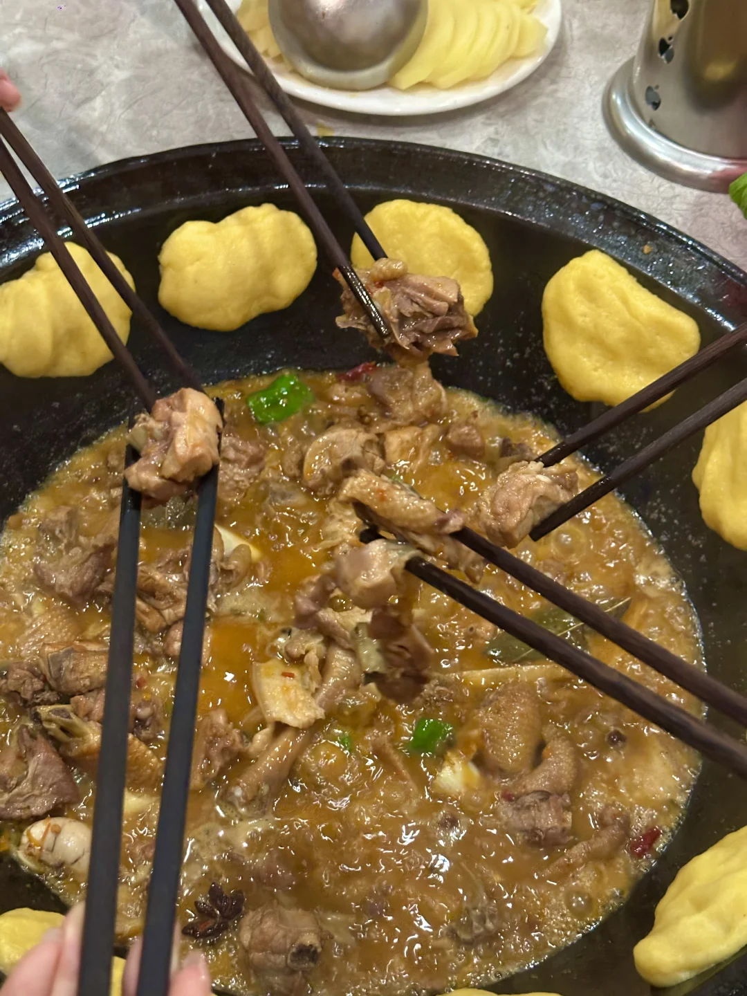 要不是吃货姐妹带路,根本找不到这口烟火气!现杀现炒的柴火鸡还没进门就香到流口水!! 阿姨炒鸡自带BGM!菜籽油滋啦下锅,鸡肉炒到金黄冒油,再哐当倒入秘制豆瓣酱,辣椒花椒一炝锅,整个院子都飘着麻辣香!铁锅里咕嘟咕嘟炖着排骨、粉条、青椒,鸡肉一抿就脱骨,连鸡皮都吸饱了汤汁,辣中带点回甜,越吃越上瘾!! 必须给锅边的玉米粑粑打call!现揉的玉米面团贴在锅边,底部被烤得焦脆,上面还是软乎乎的,带着玉米的清甜,蘸点锅里的浓汁,直接原地封神!!