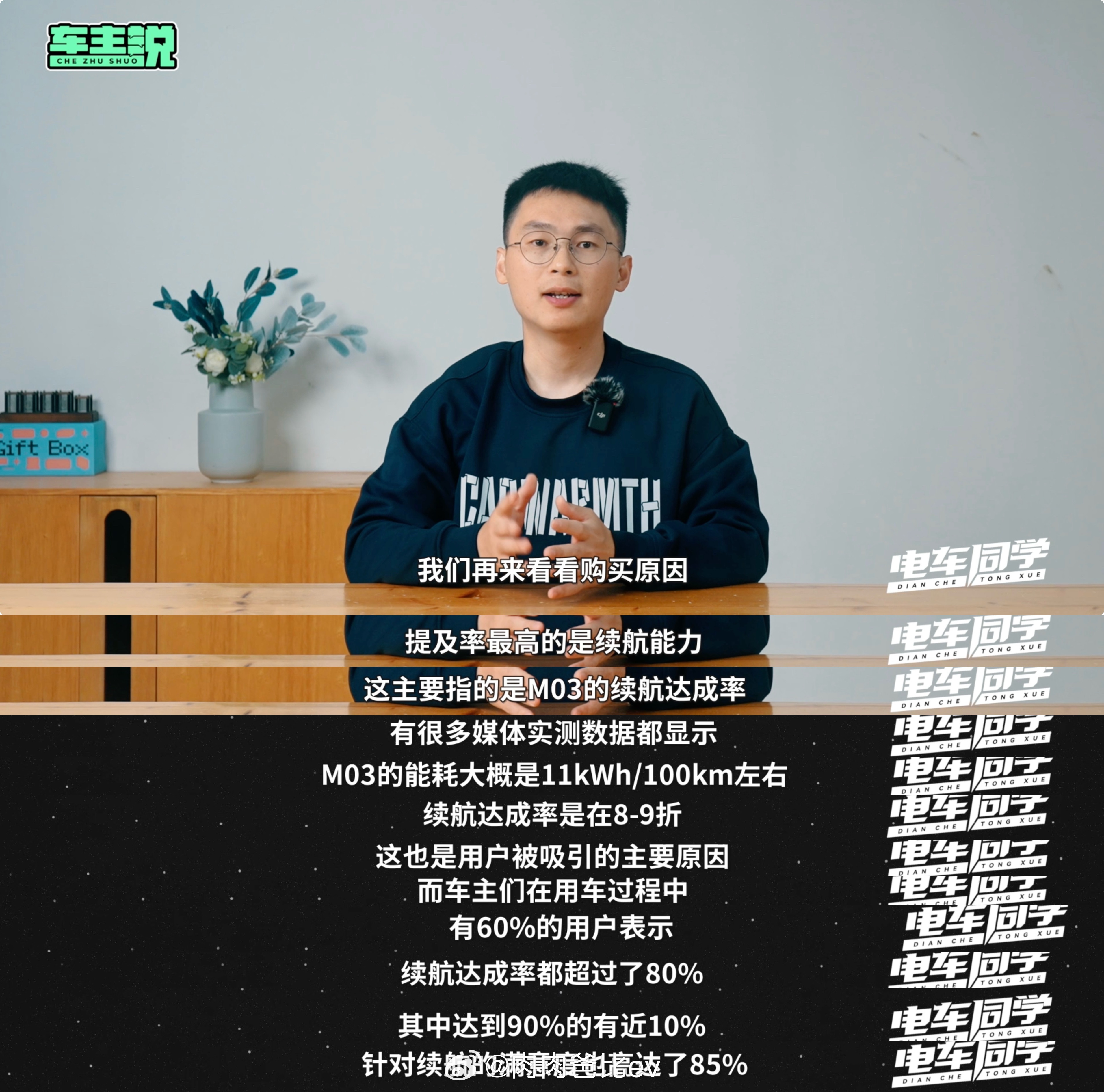 再说另一个,前几天发的MONA M03的车主调研,在车主购买原因里面,提及率最高的原因就是「续航能力」,调研的样本量是100+位真实的MONA M03车主,我们可以看图,“很多媒体实测数据显示,M03的能耗是11kWh/100km左右,续航达成率在8-9折”,这点是用户被吸引的重要原因(图4)