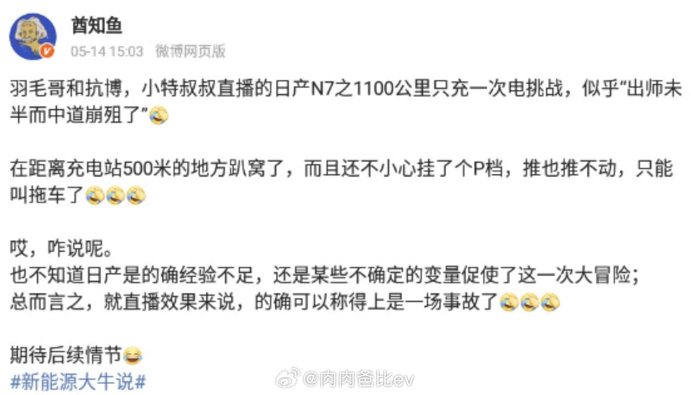 N7这次的续航挑战,我看时间线上不少人说是复刻鹏厂发布会常做的千里只充一次挑战,必须得说日产N7的发布会外场布置、发布会的PPT,以及各种演示视频的风格上面,都能看到学习新势力的影子,日产高管也不避讳这点,在微博上也有说传播上要向新势力学习,鹏厂就身处广州,那么好的学习对象不学习可惜了