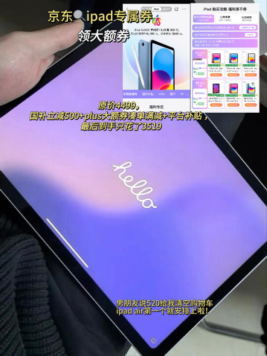 男朋友今年说不知道给我送什么,于是直接给我清空购物车啦~这次618京东国补力度太给力了,直降500,还有PLUS满减大额券,凑单下来只要3519就能买到新款的 iPad Air7,情侣 还是256g,好划算,这波羊毛薅得太深得我心啦!现在上京东APP🔍"iPad专属券"就可以get同款优惠啦!