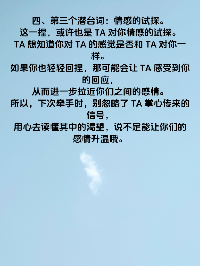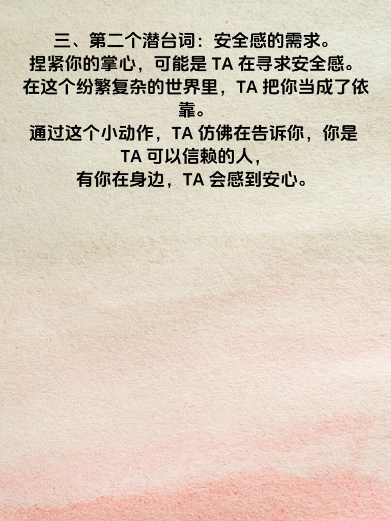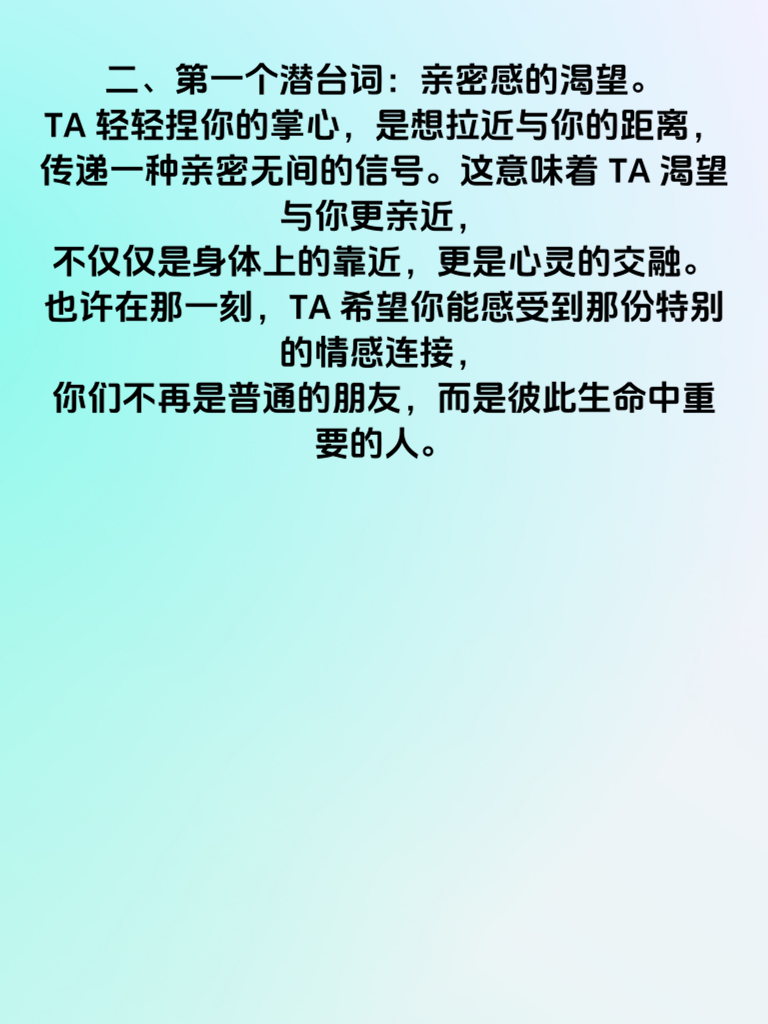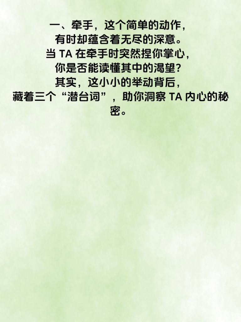 一、牵手,这个简单的动作,有时却蕴含着无尽的深意。当TA在牵手时突然捏你掌心,你是否能读懂其中的渴望?其实,这小小的举动背后,藏着三个“潜台词”,助你洞察TA内心的秘密。 二、第一个潜台词:亲密感的渴望。TA轻轻捏你的掌心,是想拉近与你的距离,传递一种亲密无间的信号。这意味着TA渴望与你更亲近,不仅仅是身体上的靠近,更是心灵的交融。也许在那一刻,TA希望你能感受到那份特别的情感连接,你们不再是普通的朋友,而是彼此生命中重要的人。 三、第二个潜台词:安全感的需求。捏紧你的掌心,可能是TA在寻求安全感。在这个纷繁复杂的世界里,TA把你当成了依靠。通过这个小动作,TA仿佛在告诉你,你是TA可以信赖的人,有你在身边,TA会感到安心。 四、第三个潜台词:情感的试探。这一捏,或许也是TA对你情感的试探。TA想知道你对TA的感觉是否和TA对你一样。如果你也轻轻回捏,那可能会让TA感受到你的回应,从而进一步拉近你们之间的感情。所以,下次牵手时,别忽略了TA掌心传来的信号,用心去读懂其中的渴望,说不定能让你们的感情升温哦。