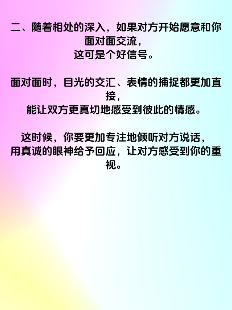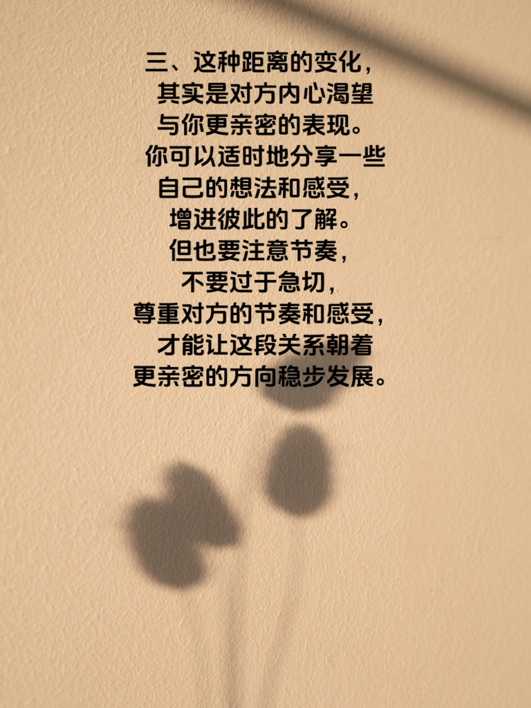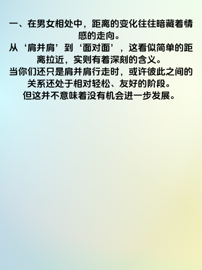 一、在男女相处中,距离的变化往往暗藏着情感的走向。从‘肩并肩’到‘面对面’,这看似简单的距离拉近,实则有着深刻的含义。当你们还只是肩并肩行走时,或许彼此之间的关系还处于相对轻松、友好的阶段。但这并不意味着没有机会进一步发展。 二、随着相处的深入,如果对方开始愿意和你面对面交流,这可是个好信号。面对面时,目光的交汇、表情的捕捉都更加直接,能让双方更真切地感受到彼此的情感。这时候,你要更加专注地倾听对方说话,用真诚的眼神给予回应,让对方感受到你的重视。 三、这种距离的变化,其实是对方内心渴望与你更亲密的表现。你可以适时地分享一些自己的想法和感受,增进彼此的了解。但也要注意节奏,不要过于急切,尊重对方的节奏和感受,才能让这段关系朝着更亲密的方向稳步发展。