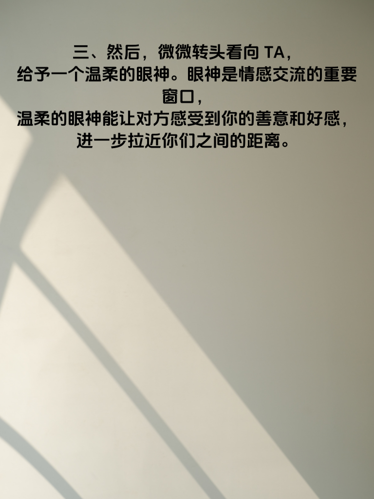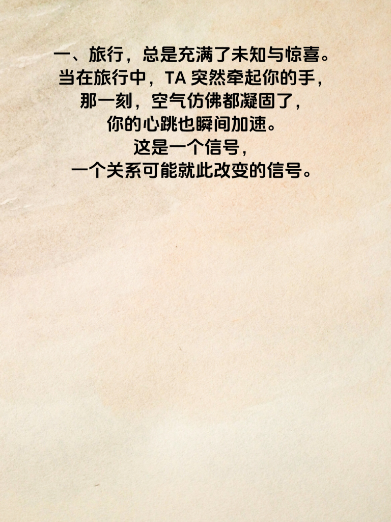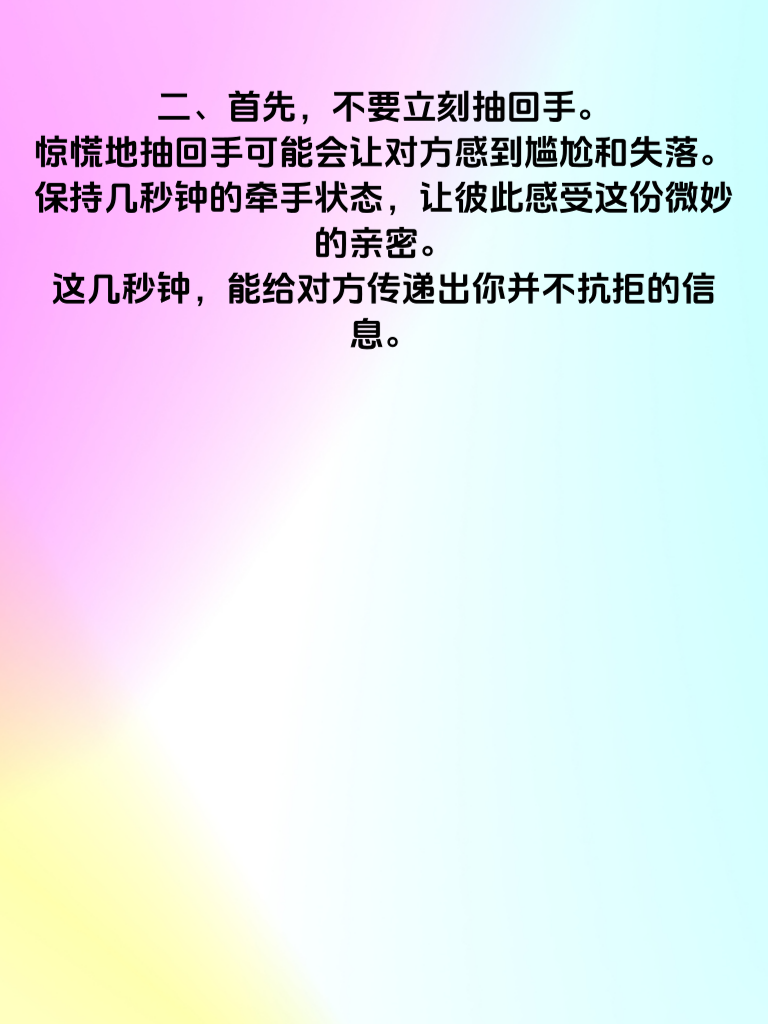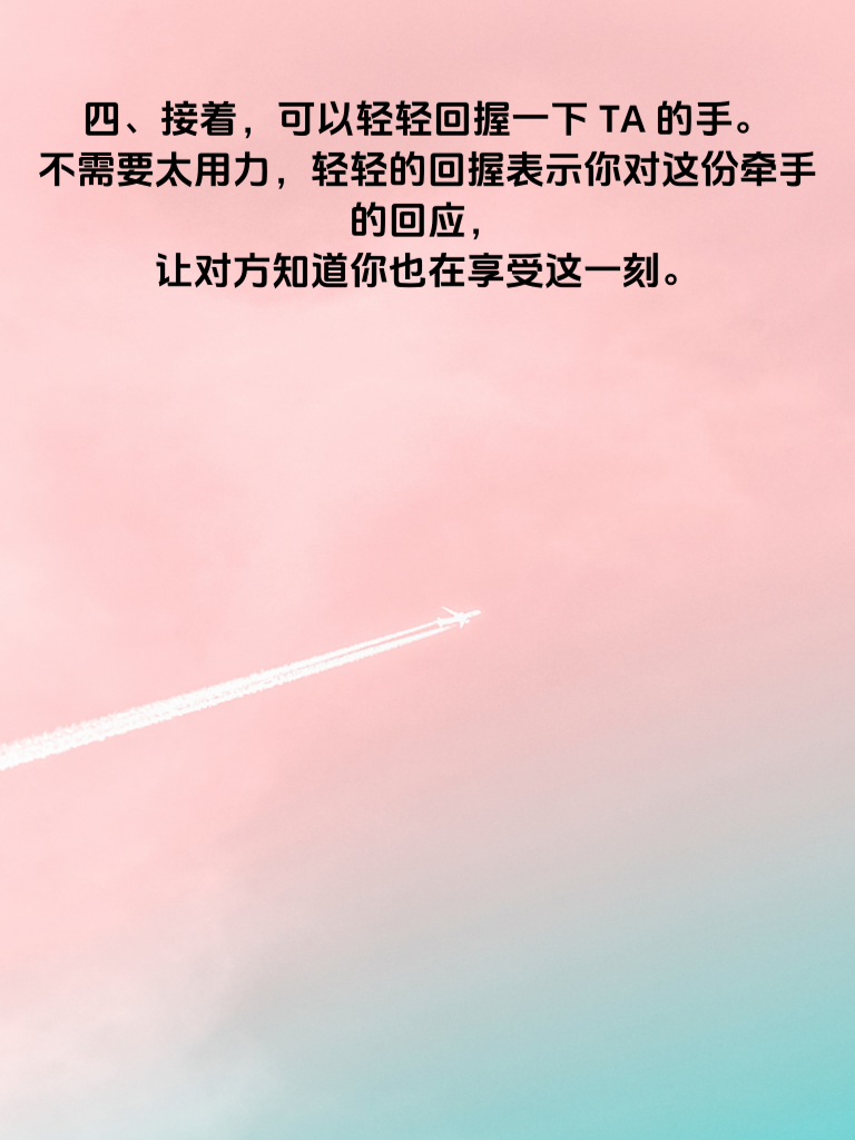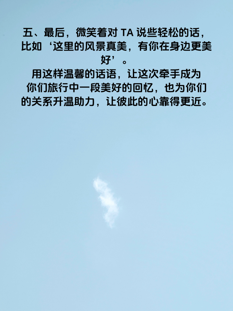 一、旅行,总是充满了未知与惊喜。当在旅行中,TA突然牵起你的手,那一刻,空气仿佛都凝固了,你的心跳也瞬间加速。这是一个信号,一个关系可能就此改变的信号。 二、首先,不要立刻抽回手。惊慌地抽回手可能会让对方感到尴尬和失落。保持几秒钟的牵手状态,让彼此感受这份微妙的亲密。这几秒钟,能给对方传递出你并不抗拒的信息。 三、然后,微微转头看向TA,给予一个温柔的眼神。眼神是情感交流的重要窗口,温柔的眼神能让对方感受到你的善意和好感,进一步拉近你们之间的距离。 四、接着,可以轻轻回握一下TA的手。不需要太用力,轻轻的回握表示你对这份牵手的回应,让对方知道你也在享受这一刻。 五、最后,微笑着对TA说些轻松的话,比如‘这里的风景真美,有你在身边更美好’。用这样温馨的话语,让这次牵手成为你们旅行中一段美好的回忆,也为你们的关系升温助力,让彼此的心靠得更近。